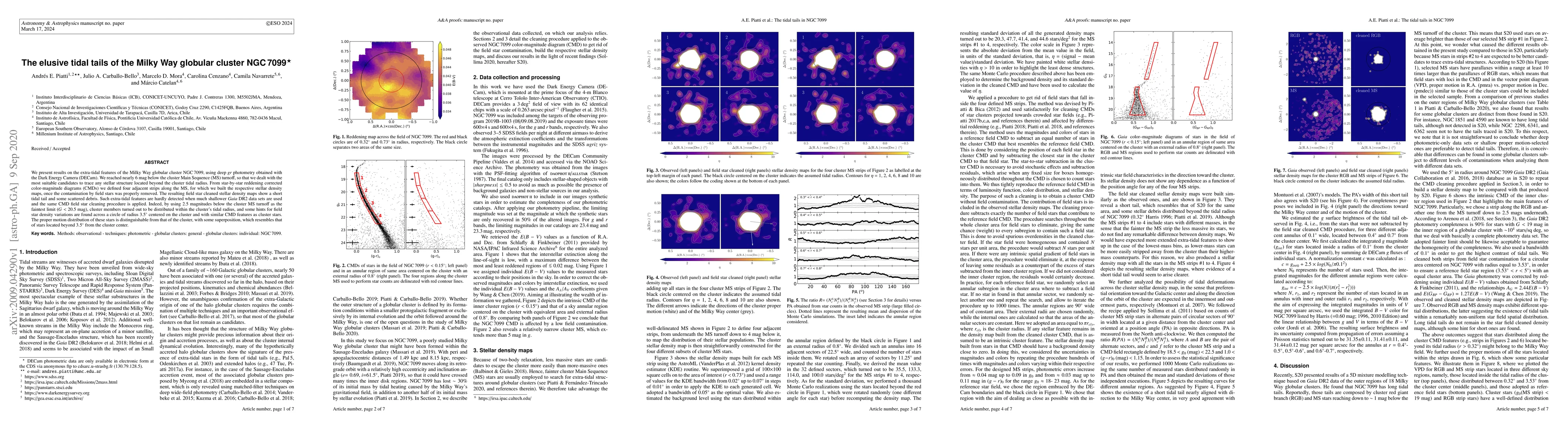 We present results on the extra-tidal features of the Milky Way globular cluster NGC 7099, using deep gr photometry obtained with the Dark Energy Camera (DECam). We reached nearly 6 mag below the cluster Main Sequence (MS) turnoff, so that we dealt with the most suitable candidates to trace any stellar structure located beyond the cluster tidal radius. From star-by-star reddening corrected color-magnitude diagrams (CMDs) we defined four adjacent strips along the MS, for which we built the respective stellar density maps, once the contamination by field stars was properly removed. The resulting field star cleaned stellar density maps show a short tidal tail and some scattered debris. Such extra-tidal features are hardly detected when much shallower Gaia DR2 data sets are used and the same CMD field star cleaning procedure is applied. Indeed, by using 2.5 magnitudes below the cluster MS turnoff as the faintest limit (G < 20.5 mag), cluster members turned out to be distributed within the cluster's tidal radius, and some hints for field star density variations are found across a circle of radius 3.5deg centered on the cluster and with similar CMD features as cluster stars. The proper motion distribution of these stars is distinguishable from that of the cluster, with some superposition, which resembles that of stars located beyond 3.5deg from the cluster center.