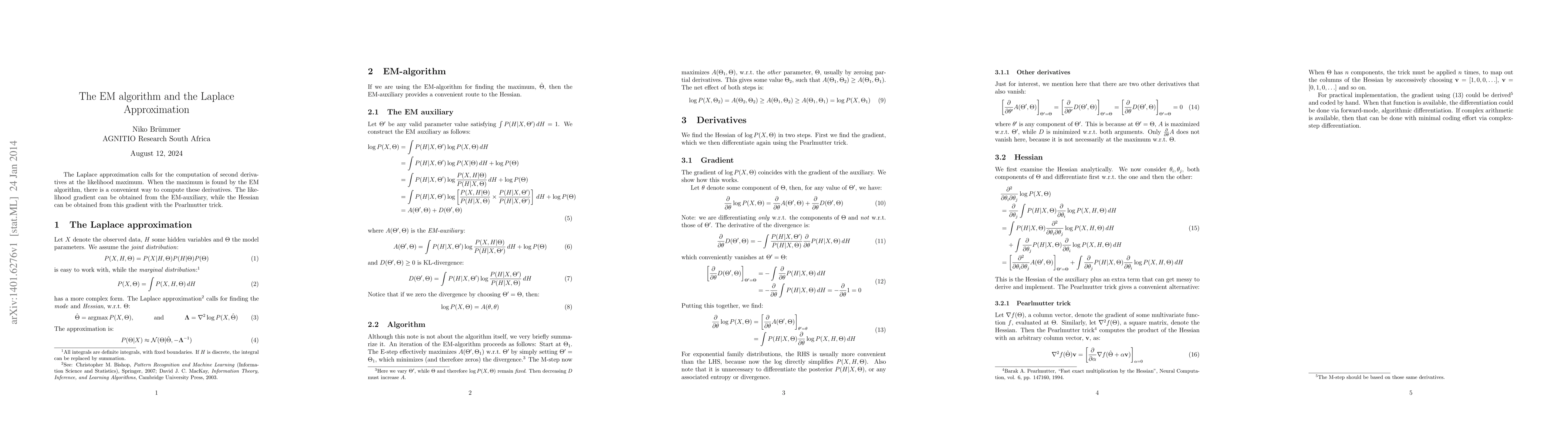Summary: The paper discusses how the Laplace approximation, which requires second derivatives at the likelihood maximum, can efficiently compute these derivatives when the maximum is found using the EM algorithm. The gradient and Hessian are derived from the EM-auxiliary and the Pearlmutter trick, respectively.