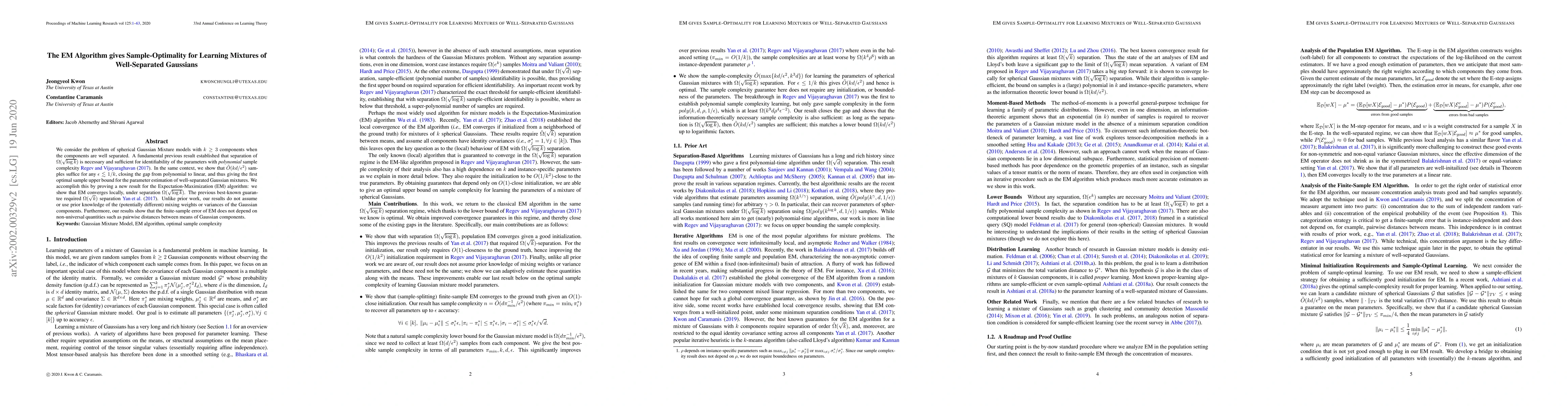 This paper demonstrates that the EM algorithm achieves sample-optimality for learning well-separated mixtures of spherical Gaussians, requiring $\tilde{O} (kd/\epsilon^2)$ samples for identifiability, closing the gap from polynomial to linear. It establishes local convergence of EM under $\Omega(\sqrt{\log k})$ separation, improving upon previous bounds that required $\Omega(\sqrt{k})$ separation.