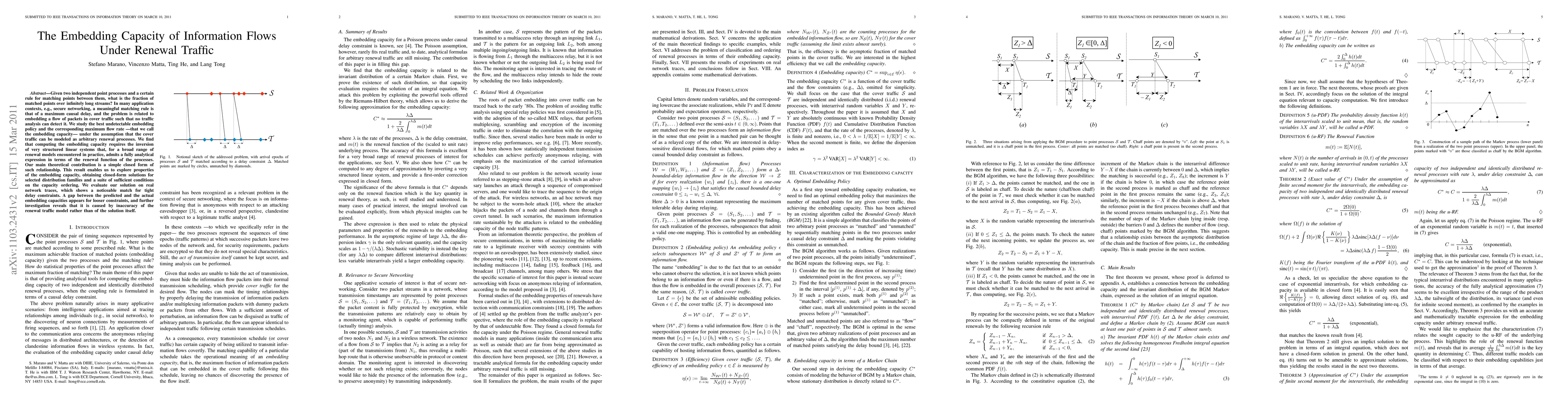 Given two independent point processes and a certain rule for matching points between them, what is the fraction of matched points over infinitely long streams? In many application contexts, e.g., secure networking, a meaningful matching rule is that of a maximum causal delay, and the problem is related to embedding a flow of packets in cover traffic such that no traffic analysis can detect it. We study the best undetectable embedding policy and the corresponding maximum flow rate ---that we call the embedding capacity--- under the assumption that the cover traffic can be modeled as arbitrary renewal processes. We find that computing the embedding capacity requires the inversion of very structured linear systems that, for a broad range of renewal models encountered in practice, admits a fully analytical expression in terms of the renewal function of the processes. Our main theoretical contribution is a simple closed form of such relationship. This result enables us to explore properties of the embedding capacity, obtaining closed-form solutions for selected distribution families and a suite of sufficient conditions on the capacity ordering. We evaluate our solution on real network traces, which shows a noticeable match for tight delay constraints. A gap between the predicted and the actual embedding capacities appears for looser constraints, and further investigation reveals that it is caused by inaccuracy of the renewal traffic model rather than of the solution itself.