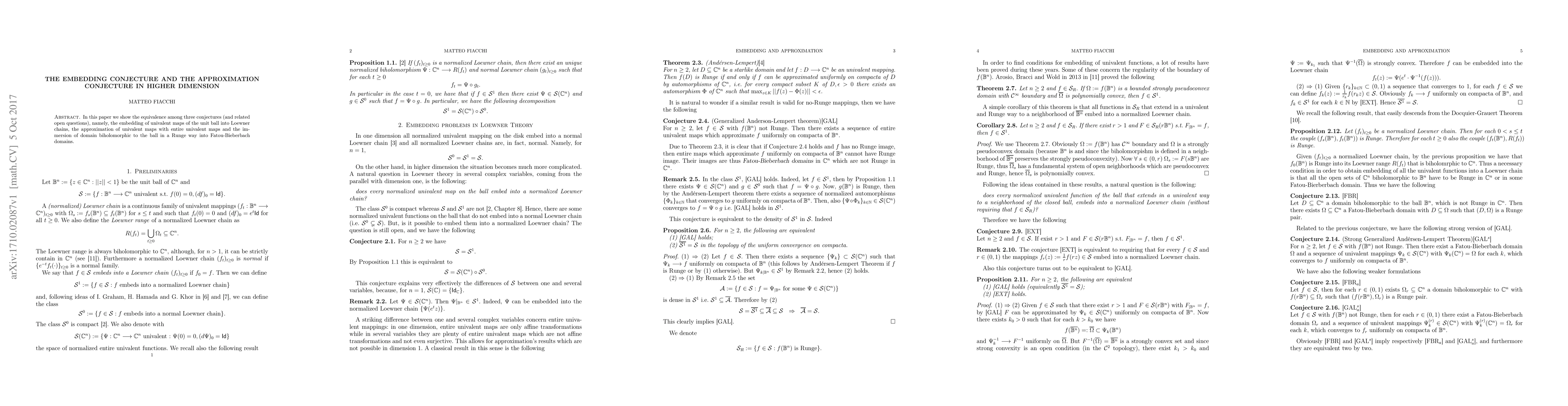The paper establishes equivalences among three conjectures concerning the embedding of univalent maps, approximation by entire univalent maps, and immersion into Fatou-Bieberbach domains, using existing theorems and propositions.