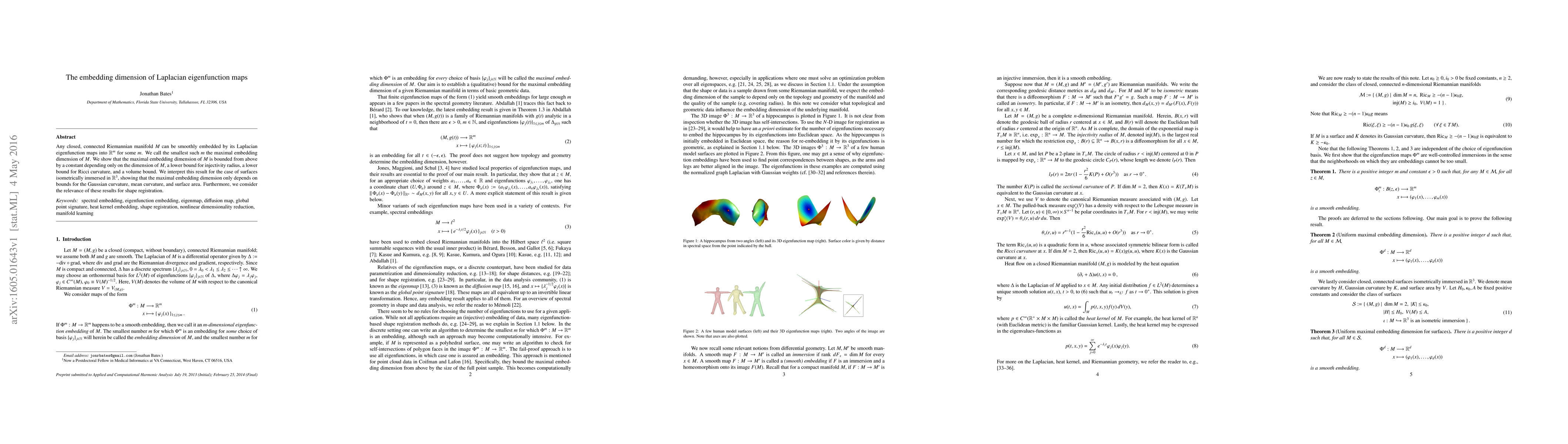 This paper investigates the maximal embedding dimension of closed, connected Riemannian manifolds via Laplacian eigenfunction maps, proving an upper bound dependent on manifold dimension, injectivity radius, Ricci curvature, and volume. For surfaces in $\mathbb{R}^3$, it shows the maximal embedding dimension depends on Gaussian curvature, mean curvature, and surface area, with implications for shape registration.
