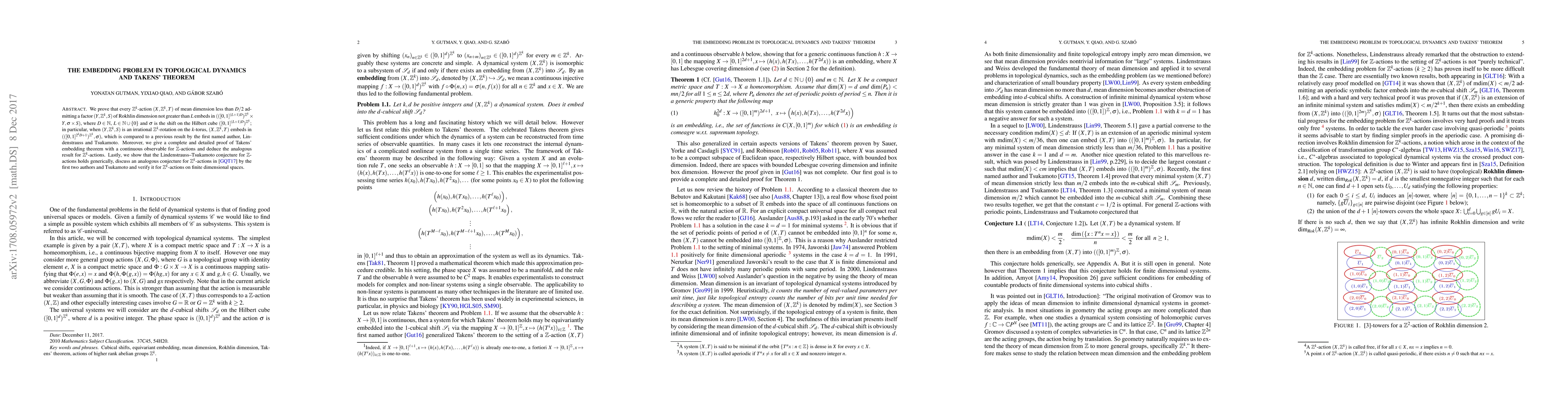 We prove that every $\mathbb{Z}^{k}$-action $(X,\mathbb{Z}^{k},T)$ of mean dimension less than $D/2$ admitting a factor $(Y,\mathbb{Z}^{k},S)$ of Rokhlin dimension not greater than $L$ embeds in $(([0,1]^{(L+1)D})^{\mathbb{Z}^{k}}\times Y,\sigma\times S)$, where $D\in\mathbb{N}$, $L\in\mathbb{N}\cup\{0\}$ and $\sigma$ is the shift on the Hilbert cube $([0,1]^{(L+1)D})^{\mathbb{Z}^{k}}$; in particular, when $(Y,\mathbb{Z}^{k},S)$ is an irrational $\mathbb{Z}^{k}$-rotation on the $k$-torus, $(X,\mathbb{Z}^{k},T)$ embeds in $(([0,1]^{2^kD+1})^{\mathbb{Z}^k},\sigma)$, which is compared to a previous result by the first named author, Lindenstrauss and Tsukamoto. Moreover, we give a complete and detailed proof of Takens' embedding theorem with a continuous observable for $\mathbb{Z}$-actions and deduce the analogous result for $\mathbb{Z}^{k}$-actions. Lastly, we show that the Lindenstrauss--Tsukamoto conjecture for $\mathbb{Z}$-actions holds generically, discuss an analogous conjecture for $\mathbb{Z}^{k}$-actions appearing in a forthcoming paper by the first two authors and Tsukamoto and verify it for $\mathbb{Z}^{k}$-actions on finite dimensional spaces.