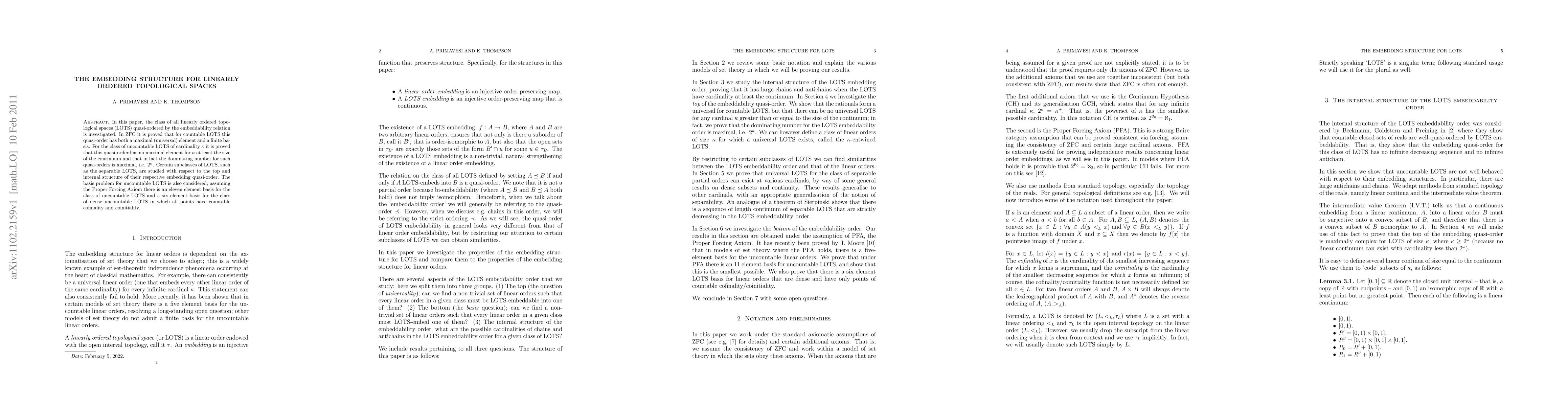 This paper investigates the embeddability quasi-order in linearly ordered topological spaces (LOTS), proving that countable LOTS have a maximal element and a finite basis, while uncountable LOTS of size at least the continuum lack a maximal element. It also explores the basis problem for uncountable LOTS under the Proper Forcing Axiom.
