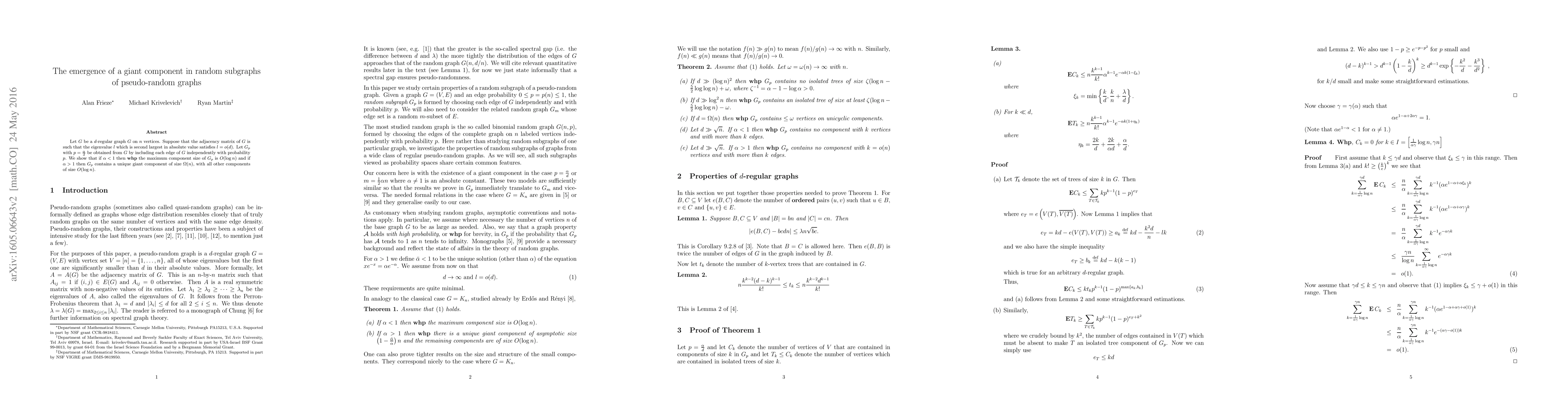 This paper investigates random subgraphs $G_p$ derived from a $d$-regular graph $G$ where the second largest eigenvalue is small relative to $d$. It demonstrates that for $p\alpha < 1$, the largest component size is $O(\log n)$, while for $p\alpha > 1$, a unique giant component of size $\Omega(n)$ emerges.