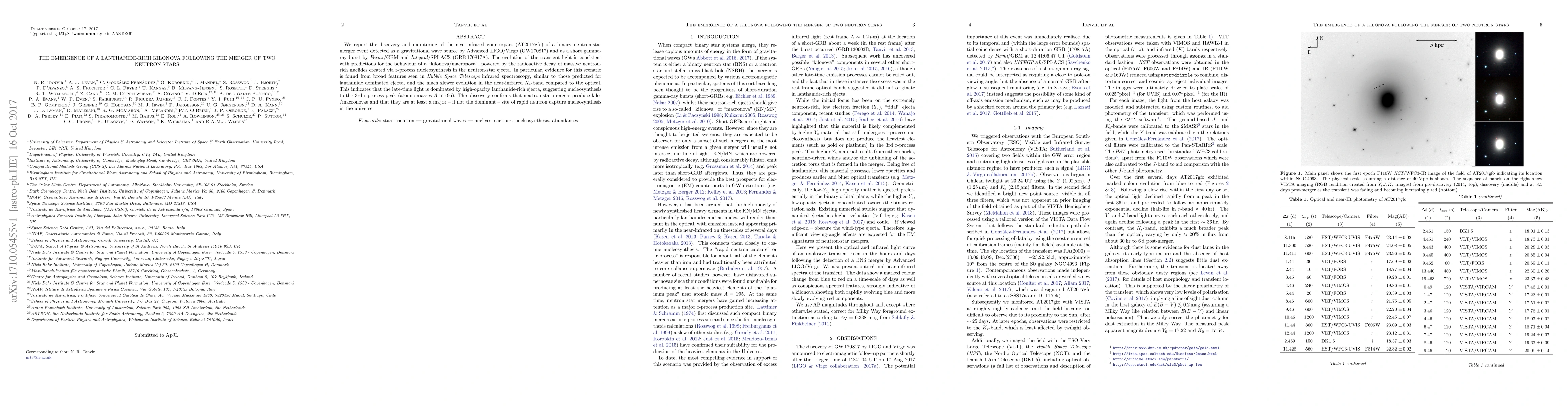 This paper reports the discovery of a lanthanide-rich kilonova following the merger of two neutron stars, identified as AT2017gfo, which correlates with gravitational wave and gamma-ray burst observations. The transient's infrared evolution supports the production of neutron-rich nuclides via r-process nucleosynthesis, indicating the importance of neutron-star mergers in rapid neutron capture processes.