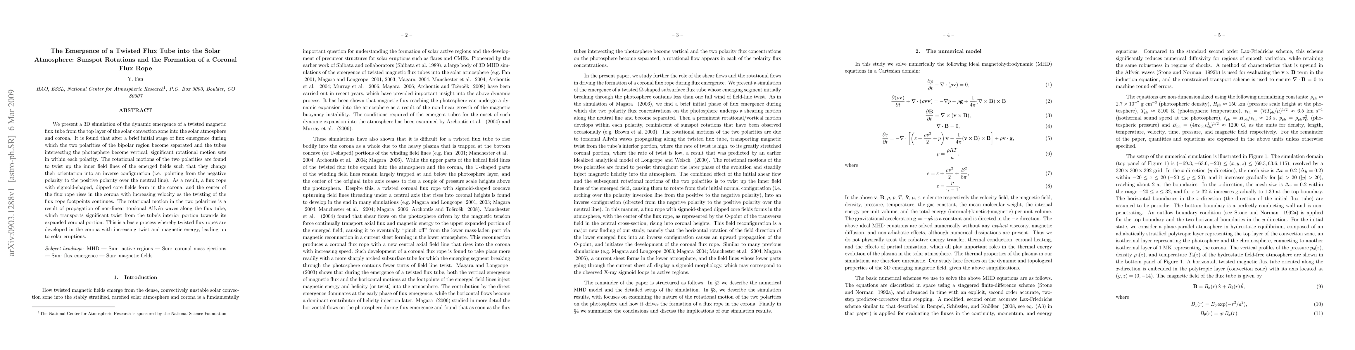 This paper presents a 3D simulation showing the emergence of a twisted magnetic flux tube into the solar atmosphere, leading to sunspot rotations and the formation of a coronal flux rope. The study reveals that rotational motions within the polarities twist the field lines, resulting in a sigmoid-shaped flux rope in the corona, driven by torsional Alfvén waves.