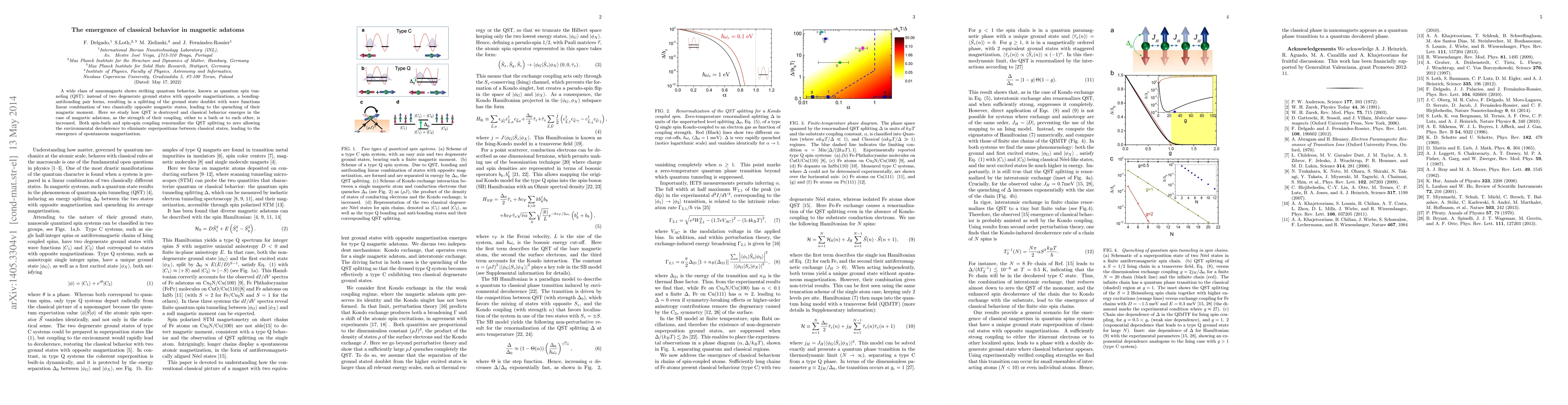 This paper investigates how quantum spin tunneling (QST) in nanomagnets is disrupted, leading to the emergence of classical behavior in magnetic adatoms. Increased coupling to the substrate or between adatoms eliminates QST, resulting in spontaneous magnetization.