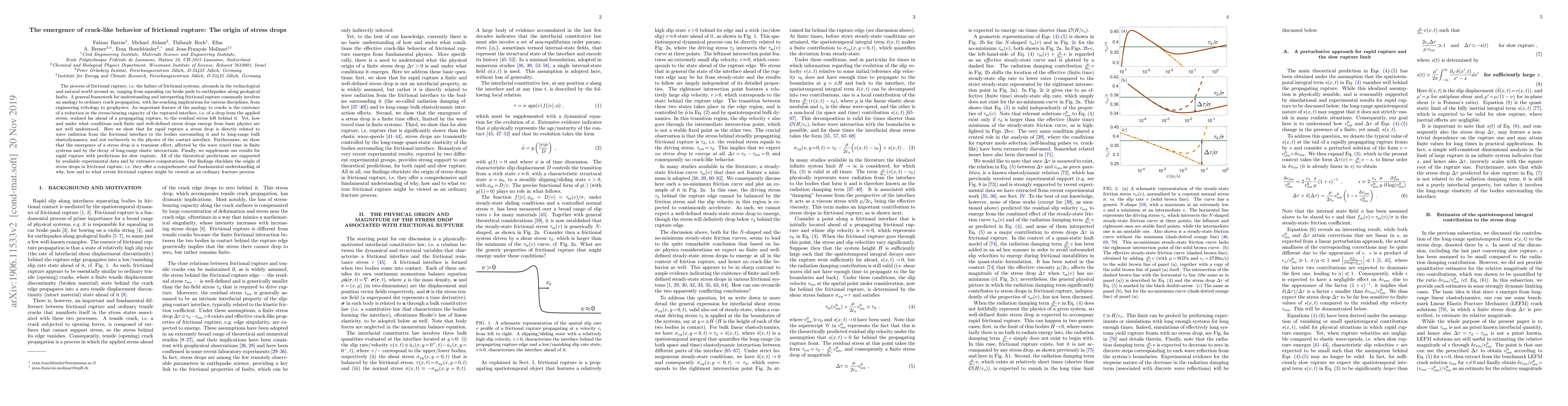 This research paper investigates the emergence of crack-like behavior in frictional rupture and identifies the origin of stress drops in such systems. It reveals that stress drops arise due to wave radiation and bulk elastodynamics rather than just contact interface physics, and are transient phenomena influenced by wave travel time and elastic interaction decay. Theoretical predictions are validated by experimental data and simulations.