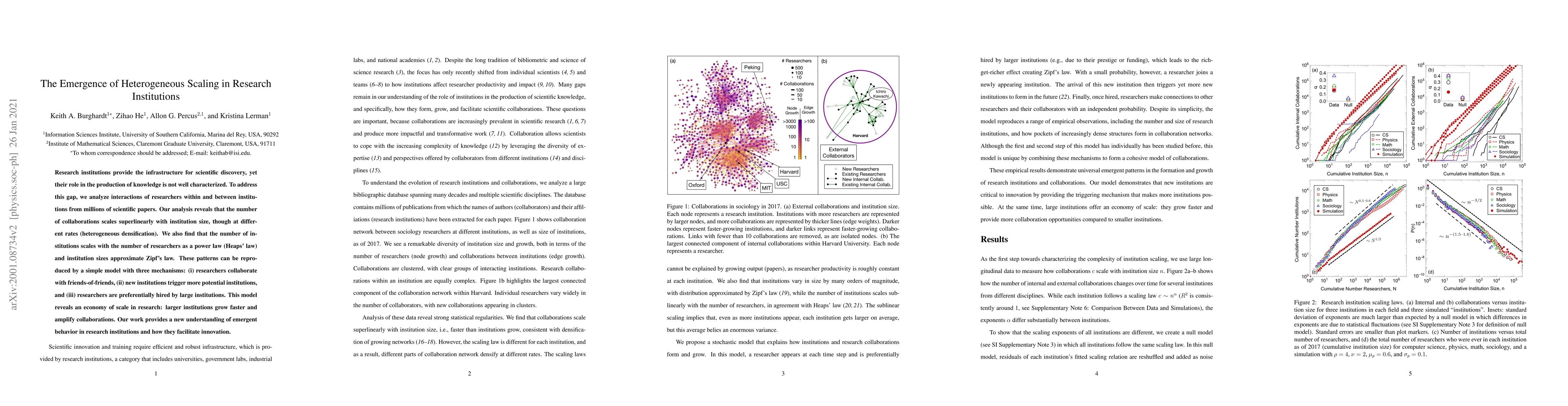 Research institutions provide the infrastructure for scientific discovery, yet their role in the production of knowledge is not well characterized. To address this gap, we analyze interactions of researchers within and between institutions from millions of scientific papers. Our analysis reveals that the number of collaborations scales superlinearly with institution size, though at different rates (heterogeneous densification). We also find that the number of institutions scales with the number of researchers as a power law (Heaps' law) and institution sizes approximate Zipf's law. These patterns can be reproduced by a simple model with three mechanisms: (i) researchers collaborate with friends-of-friends, (ii) new institutions trigger more potential institutions, and (iii) researchers are preferentially hired by large institutions. This model reveals an economy of scale in research: larger institutions grow faster and amplify collaborations. Our work provides a new understanding of emergent behavior in research institutions and how they facilitate innovation.