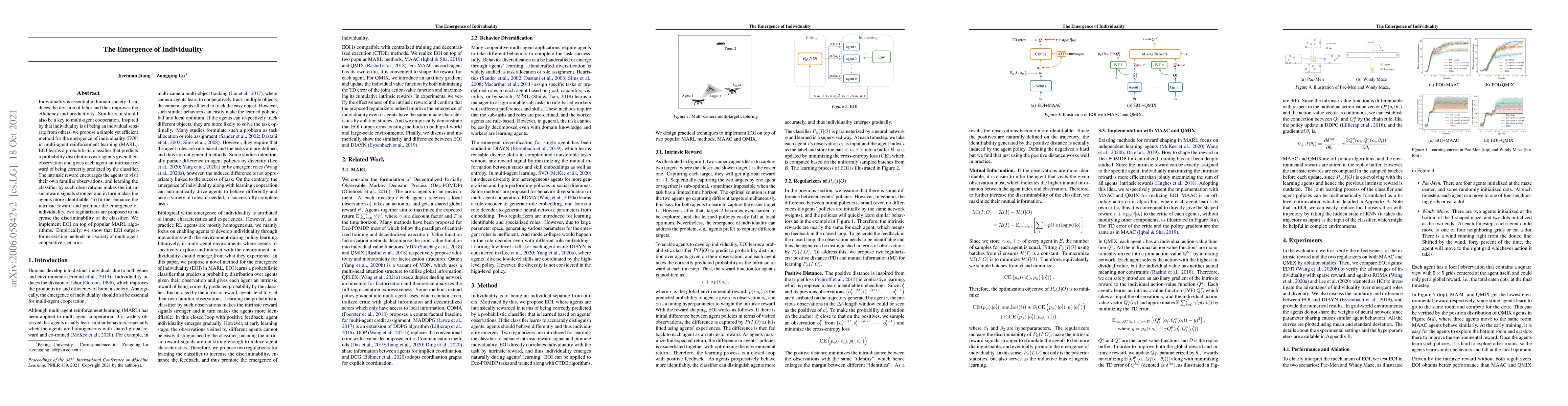 This paper proposes a method called Emergence of Individuality (EOI) to enhance individuality in multi-agent reinforcement learning. EOI uses a probabilistic classifier to assign intrinsic rewards based on agents' observations, promoting their unique behaviors and improving discriminability, which significantly outperforms existing methods.