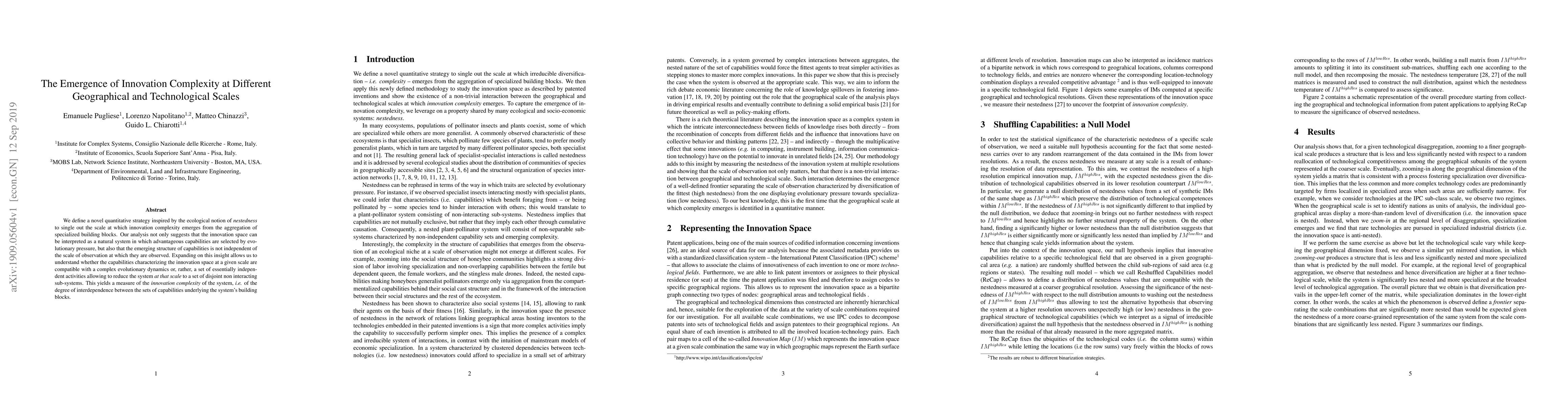 We define a novel quantitative strategy inspired by the ecological notion of nestedness to single out the scale at which innovation complexity emerges from the aggregation of specialized building blocks. Our analysis not only suggests that the innovation space can be interpreted as a natural system in which advantageous capabilities are selected by evolutionary pressure, but also that the emerging structure of capabilities is not independent of the scale of observation at which they are observed. Expanding on this insight allows us to understand whether the capabilities characterizing the innovation space at a given scale are compatible with a complex evolutionary dynamics or, rather, a set of essentially independent activities allowing to reduce the system at that scale to a set of disjoint non interacting sub-systems. This yields a measure of the innovation complexity of the system, i.e. of the degree of interdependence between the sets of capabilities underlying the system's building blocks.