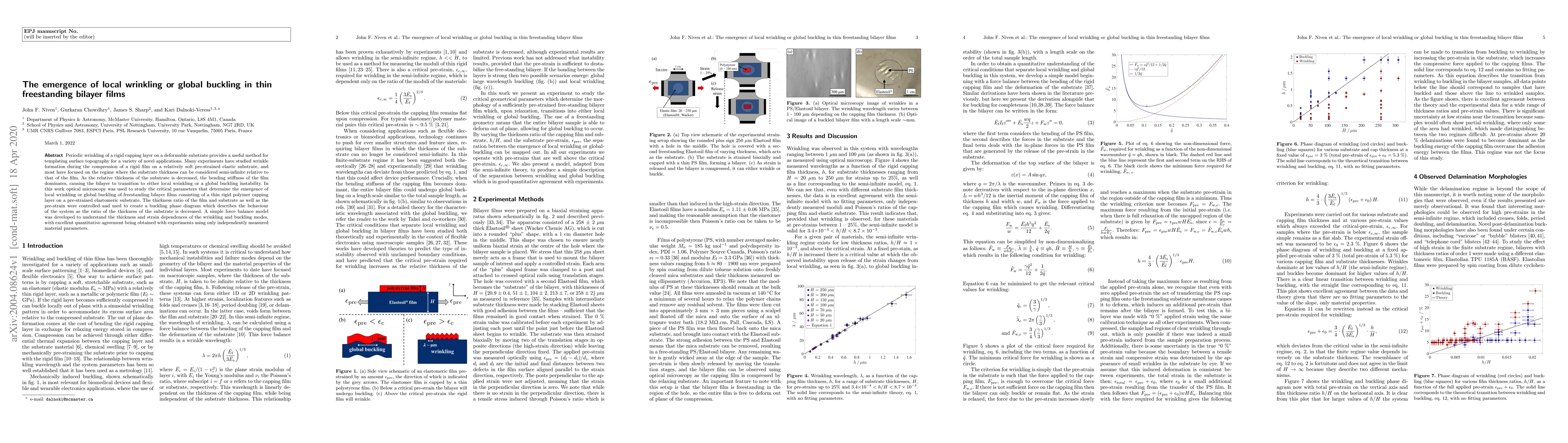 This study investigates the transition between local wrinkling and global buckling in thin freestanding bilayer films, employing optical microscopy and a buckling phase diagram to determine critical parameters. A force balance model accurately predicts the thickness and strain dependences, corroborating experimental observations.