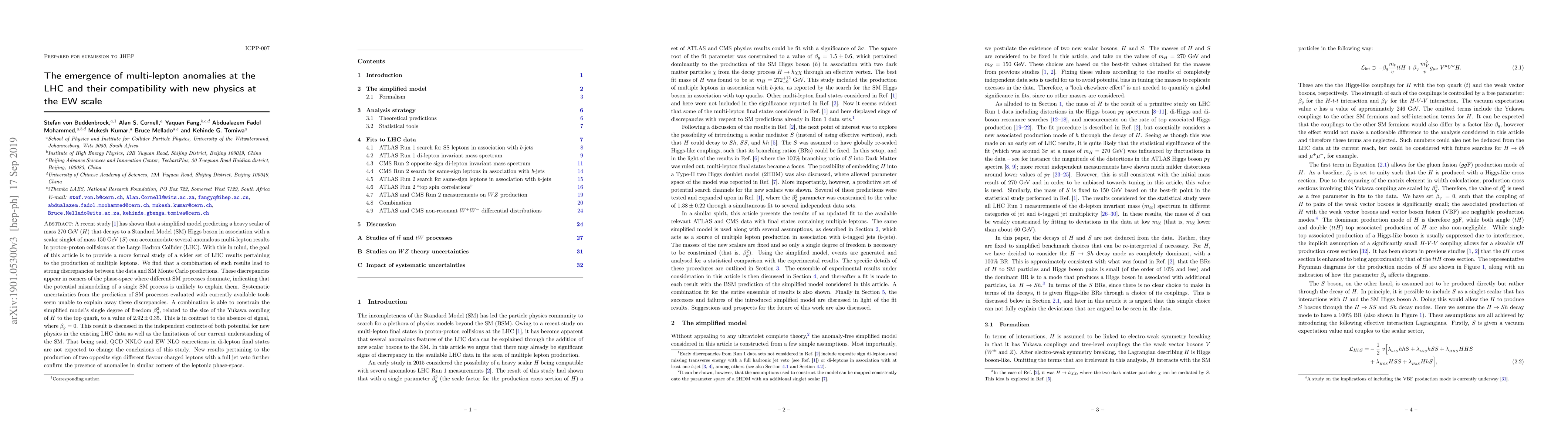 A recent study [1] has shown that a simplified model predicting a heavy scalar of mass 270 GeV ($H$) that decays to a Standard Model (SM) Higgs boson in association with a scalar singlet of mass 150 GeV ($S$) can accommodate several anomalous multi-lepton results in proton-proton collisions at the Large Hadron Collider (LHC). With this in mind, the goal of this article is to provide a more formal study of a wider set of LHC results pertaining to the production of multiple leptons. We find that a combination of such results lead to strong discrepancies between the data and SM Monte Carlo predictions. These discrepancies appear in corners of the phase-space where different SM processes dominate, indicating that the potential mismodeling of a single SM process is unlikely to explain them. Systematic uncertainties from the prediction of SM processes evaluated with currently available tools seem unable to explain away these discrepancies. A combination is able to constrain the simplified model's single degree of freedom $\beta_g^2$, related to the size of the Yukawa coupling of $H$ to the top quark, to a value of $2.92\pm 0.35$. This is in contrast to the absence of signal, where $\beta_g=0$. This result is discussed in the independent contexts of both potential for new physics in the existing LHC data as well as the limitations of our current understanding of the SM. That being said, QCD NNLO and EW NLO corrections in di-lepton final states are not expected to change the conclusions of this study. New results pertaining to the production of two opposite sign different flavour charged leptons with a full jet veto further confirm the presence of anomalies in similar corners of the leptonic phase-space.