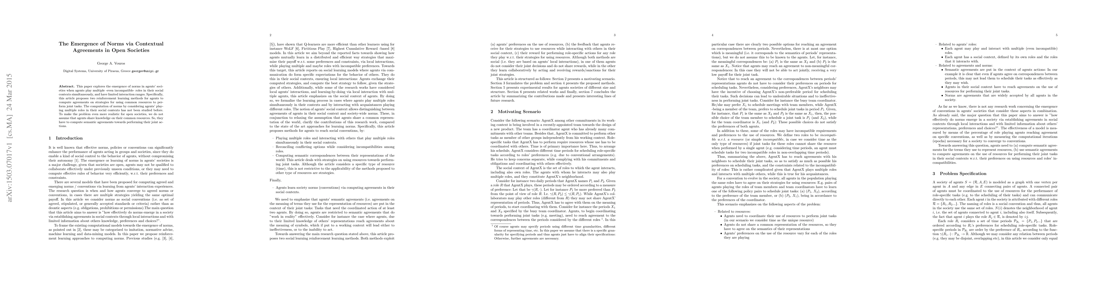 This paper investigates how norms emerge in open societies through contextual agreements among agents playing multiple roles, proposing two reinforcement learning methods for strategy computation. Empirical results show efficient convergence to norms, even in complex settings with limited shared knowledge.