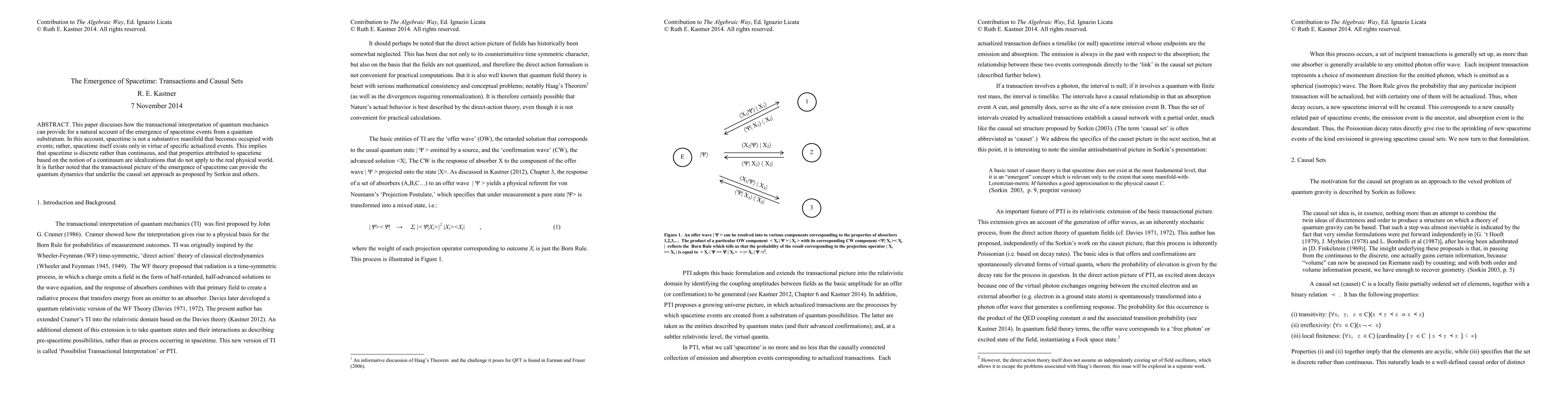 This paper proposes a new understanding of spacetime as emerging from actualized quantum events, suggesting it is discrete rather than continuous. It also explores the connection between transactional interpretation and the causal set approach to quantum dynamics.