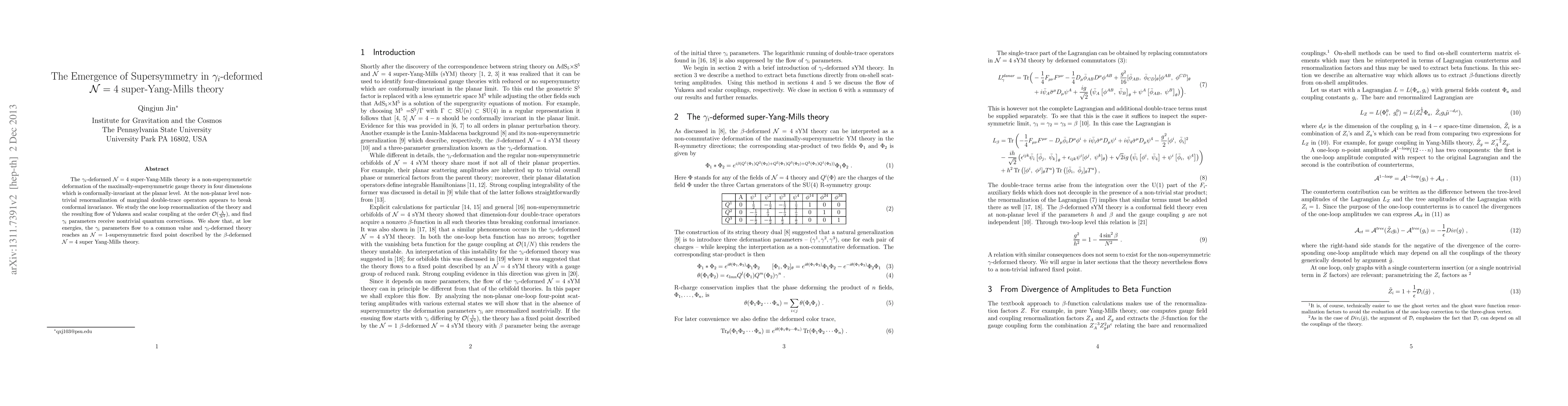 This paper investigates the one-loop renormalization of $\gamma_i$-deformed $\mathcal{N}=4$ super-Yang-Mills theory, finding that it leads to a common value for $\gamma_i$ parameters at low energies, indicating an emergent $\mathcal{N}=1$ supersymmetry described by the $\beta$-deformed $\mathcal{N}=4$ super Yang-Mills theory.