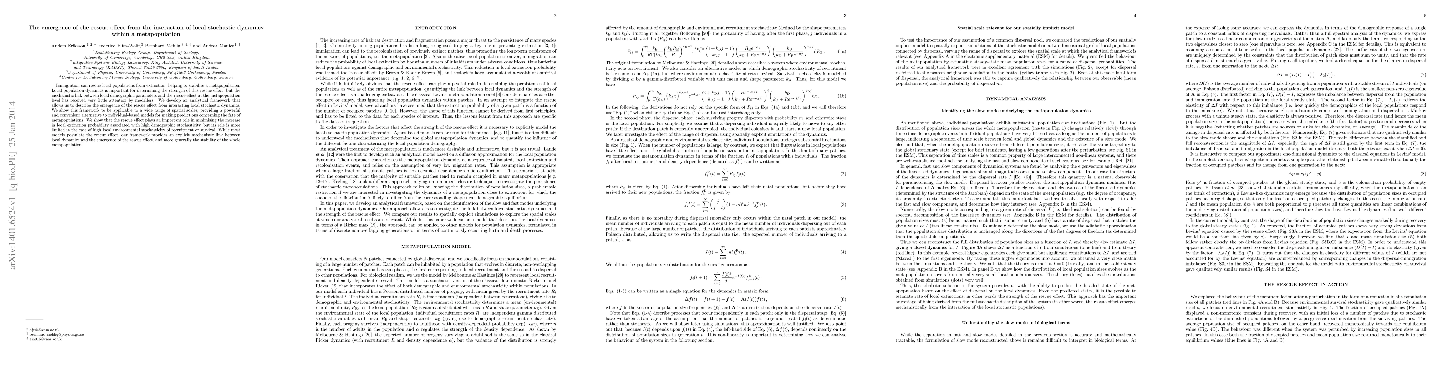 Immigration can rescue local populations from extinction, helping to stabilise a metapopulation. Local population dynamics is important for determining the strength of this rescue effect, but the mechanistic link between local demographic parameters and the rescue effect at the metapopulation level has received very little attention by modellers. We develop an analytical framework that allows us to describe the emergence of the rescue effect from interacting local stochastic dynamics. We show this framework to be applicable to a wide range of spatial scales, providing a powerful and convenient alternative to individual-based models for making predictions concerning the fate of metapopulations. We show that the rescue effect plays an important role in minimising the increase in local extinction probability associated with high demographic stochasticity, but its role is more limited in the case of high local environmental stochasticity of recruitment or survival. While most models postulate the rescue effect, our framework provides an explicit mechanistic link between local dynamics and the emergence of the rescue effect, and more generally the stability of the whole metapopulation.