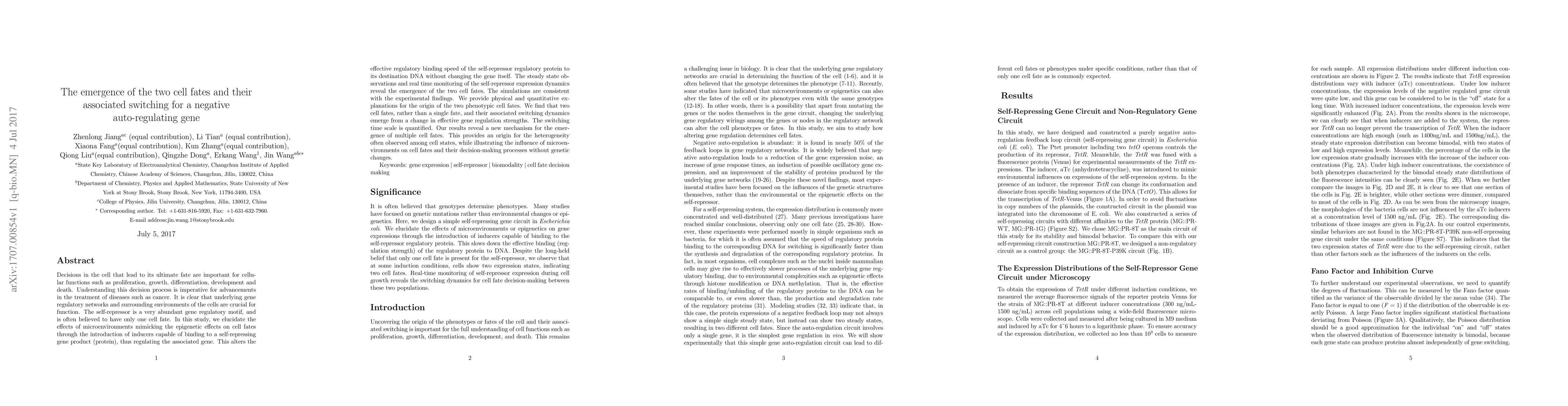 Decisions in the cell that lead to its ultimate fate are important for cellular functions such as proliferation, growth, differentiation, development and death. Understanding this decision process is imperative for advancements in the treatment of diseases such as cancer. It is clear that underlying gene regulatory networks and surrounding environments of the cells are crucial for function. The self-repressor is a very abundant gene regulatory motif, and is often believed to have only one cell fate. In this study, we elucidate the effects of microenvironments mimicking the epigenetic effects on cell fates through the introduction of inducers capable of binding to a self-repressing gene product (protein), thus regulating the associated gene. This alters the effective regulatory binding speed of the self-repressor regulatory protein to its destination DNA without changing the gene itself. The steady state observations and real time monitoring of the self-repressor expression dynamics reveal the emergence of the two cell fates, The simulations are consistent with the experimental findings. We provide physical and quantitative explanations for the origin of the two phenotypic cell fates. We find that two cell fates, rather than a single fate, and their associated switching dynamics emerge from a change in effective gene regulation strengths. The switching time scale is quantified. Our results reveal a new mechanism for the emergence of multiple cell fates. This provides an origin for the heterogeneity often observed among cell states, while illustrating the influence of microenvironments on cell fates and their decision-making processes without genetic changes