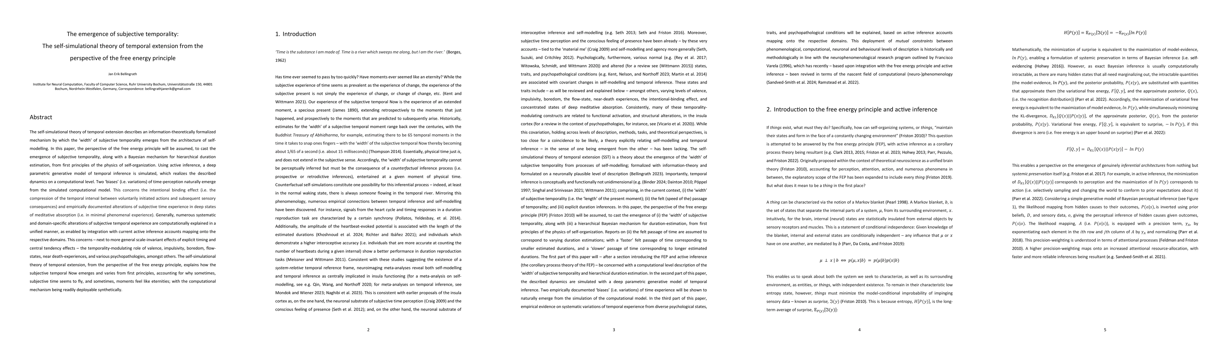 The self-simulational theory of temporal extension describes an information-theoretically formalized mechanism by which the width of subjective temporality emerges from the architecture of self-modelling. In this paper, the perspective of the free energy principle will be assumed, to cast the emergence of subjective temporality, along with a mechanism for duration estimation, from first principles of the physics of self-organization. Using active inference, a deep parametric generative model of temporal inference is simulated, which realizes the described dynamics on a computational level. Two biases (i.e. variations) of time-perception naturally emerge from the simulation. This concerns the intentional binding effect (i.e. the subjective compression of the temporal interval between voluntarily initiated actions and subsequent sensory consequences) and empirically documented alterations of subjective time experience in deep and concentrated states of meditative absorption. Generally, numerous systematic and domain-specific variations of subjective time experience are computationally explained, as enabled by integration with current active inference accounts mapping onto the respective domains. This concerns the temporality modulating role of negative valence, impulsivity, boredom, flow-states, and near death-experiences, amongst others. The self-simulational theory of temporal extension, from the perspective of the free energy principle, explains how the subjective temporal Now emerges and varies from first principles, accounting for why sometimes, subjective time seems to fly, and sometimes, moments feel like eternities; with the computational mechanism being readily deployable synthetically.