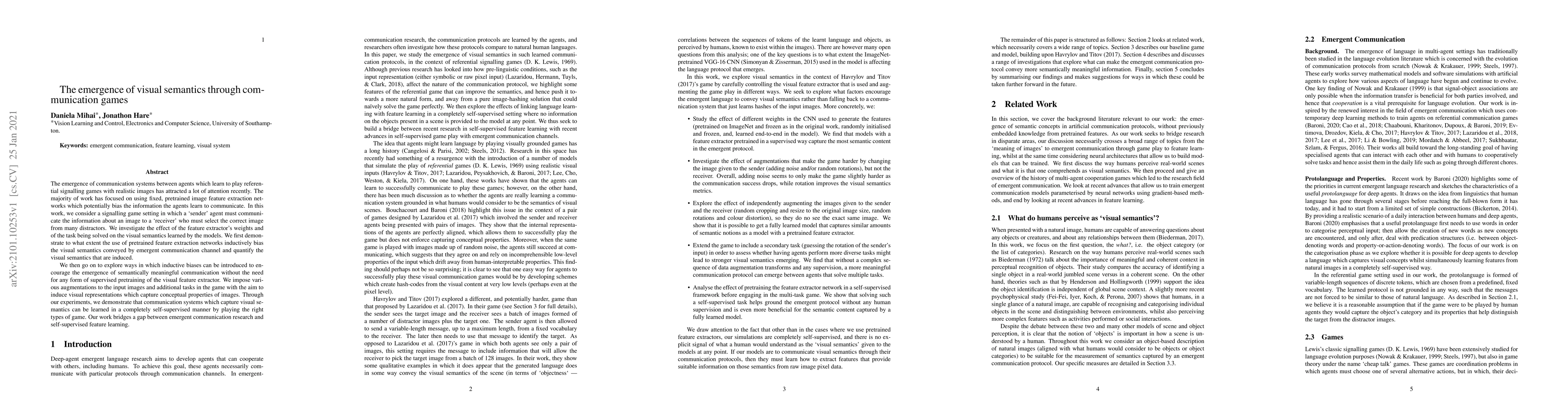 The emergence of communication systems between agents which learn to play referential signalling games with realistic images has attracted a lot of attention recently. The majority of work has focused on using fixed, pretrained image feature extraction networks which potentially bias the information the agents learn to communicate. In this work, we consider a signalling game setting in which a `sender' agent must communicate the information about an image to a `receiver' who must select the correct image from many distractors. We investigate the effect of the feature extractor's weights and of the task being solved on the visual semantics learned by the models. We first demonstrate to what extent the use of pretrained feature extraction networks inductively bias the visual semantics conveyed by emergent communication channel and quantify the visual semantics that are induced. We then go on to explore ways in which inductive biases can be introduced to encourage the emergence of semantically meaningful communication without the need for any form of supervised pretraining of the visual feature extractor. We impose various augmentations to the input images and additional tasks in the game with the aim to induce visual representations which capture conceptual properties of images. Through our experiments, we demonstrate that communication systems which capture visual semantics can be learned in a completely self-supervised manner by playing the right types of game. Our work bridges a gap between emergent communication research and self-supervised feature learning.
