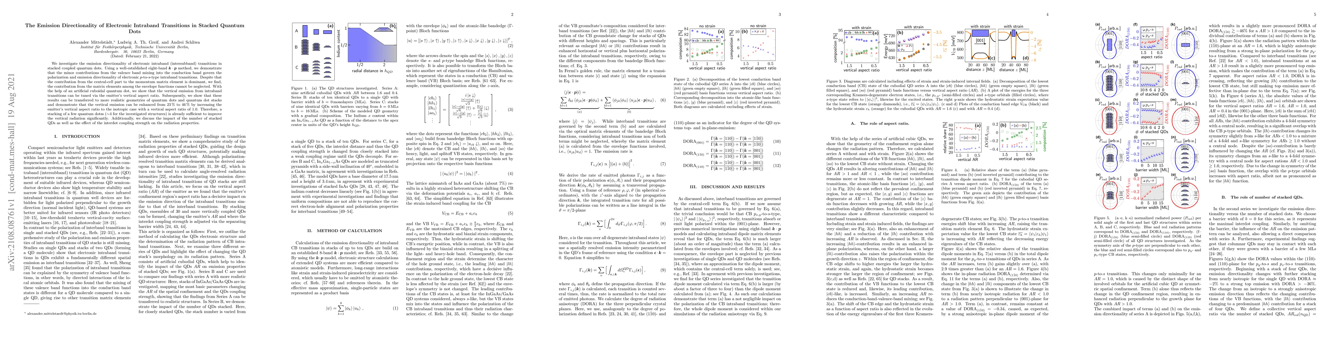 This paper investigates the emission directionality of intraband transitions in stacked quantum dots, demonstrating that the polarization and directionality are governed by valence band mixing and envelope function matrix elements. The study shows that vertical emission can be tuned by adjusting the vertical aspect ratio of the quantum dot stack, enhancing it from 23% to 46% with a ratio of 1.0.