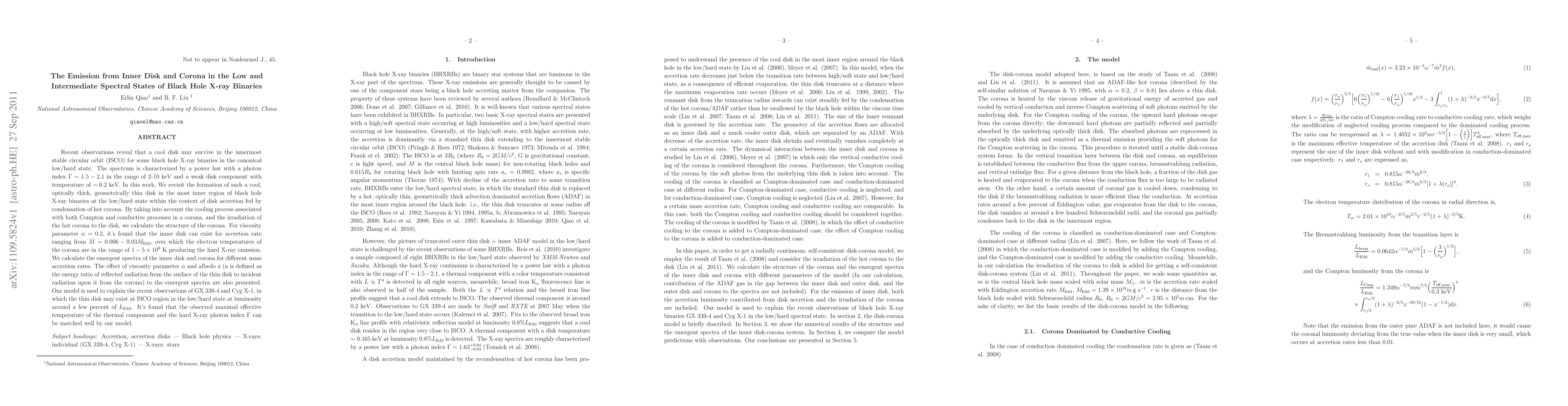 This paper investigates the emission from the inner disk and corona in black hole X-ray binaries during low and intermediate spectral states, finding that a cool, optically thick disk can exist near the innermost stable circular orbit. The model accounts for corona cooling processes and irradiation, showing that the inner disk can exist for accretion rates between 0.006-0.03 times the Eddington rate, producing hard X-ray emissions.