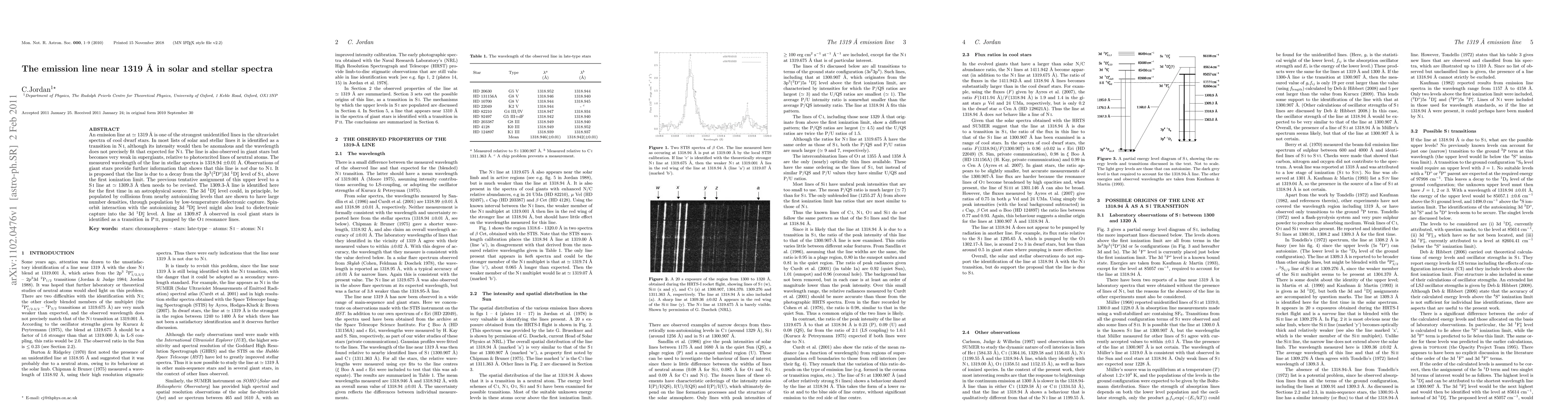 An emission line near 1319 A is one of the strongest unidentified lines in the ultraviolet spectra of cool dwarf stars. In most line lists it is identified as a transition in N I, although its intensity would then be anomalous and the observed wavelength does not fit precisely that expected for N I. The line is also observed in cool giant stars. The measured wavelength of the line in stellar spectra is 1318.94 (+,- 0.01) A. Observations of giant stars provide further evidence that this line is not due to N I. It is proposed that this line is a decay from a previously unknown level in S I, which lies above the first ionization limit. This is identified with the 3d singlet D (odd parity) term. The previous tentative assignment of this term to the S I line at 1309.3 A then needs to be revised. The 1309.3 A line has been identified here for the first time in an astrophysical source. The singlet D (odd parity) level could, in principle, be populated by collisions from nearby autoionizing levels that have large number-densities, through population by di-electronic capture. Spin-orbit interaction with the autoionizing triplet D (odd parity) term might also lead to di-electronic capture into the singlet D (odd parity) level. A line at 1309.87 A observed in cool giant stars is identified as a transition in P II, pumped by the O I resonance lines.