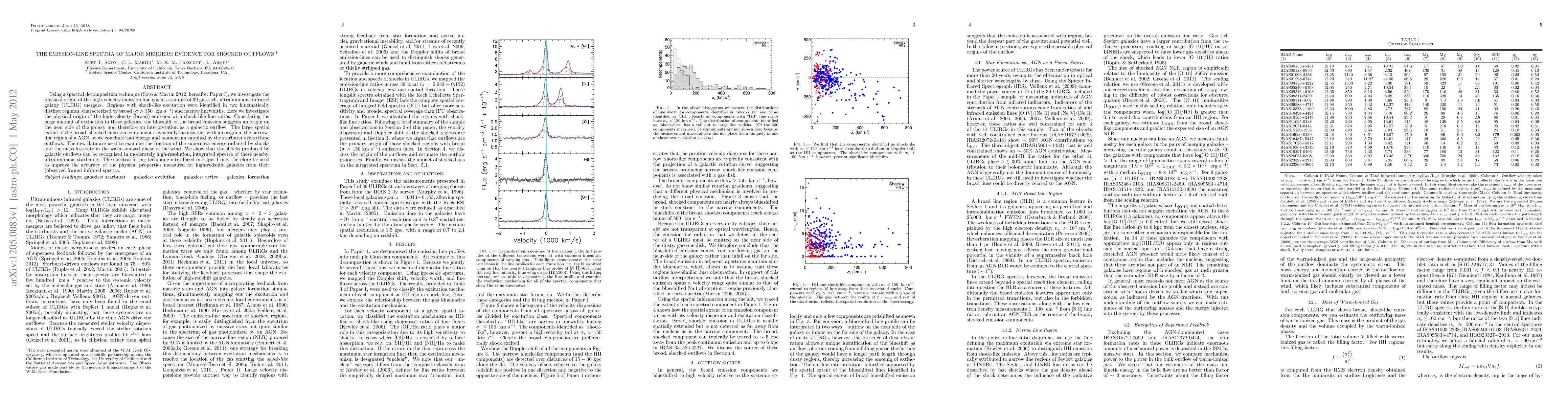 Using a spectral decomposition technique (Soto & Martin 2012, hereafter Paper I), we investigate the physical origin of the high-velocity emission line gas in a sample of 39 gas-rich, ultraluminous infrared galaxy (ULIRG) mergers. Regions with shock-like excitation were identified in two kinematically distinct regimes, characterized by broad ($\sigma >$ 150 \kms) and narrow linewidths. Here we investigate the physical origin of the high-velocity (broad) emission with shock-like line ratios. Considering the large amount of extinction in these galaxies, the blueshift of the broad emission suggests an origin on the near side of the galaxy and therefore an interpretation as a galactic outflow. The large spatial extent of the broad, shocked emission component is generally inconsistent with an origin in the narrow-line region of a AGN, so we conclude that energy and momentum supplied by the starburst drives these outflows. The new data are used to examine the fraction of the supernova energy radiated by shocks and the mass loss rate in the warm-ionized phase of the wind. We show that the shocks produced by galactic outflows can be recognized in moderately high-resolution, integrated spectra of these nearby, ultraluminous starbursts. The spectral fitting technique introduced in Paper I may therefore be used to improve the accuracy of the physical properties measured for high-redshift galaxies from their (observed frame) infrared spectra.