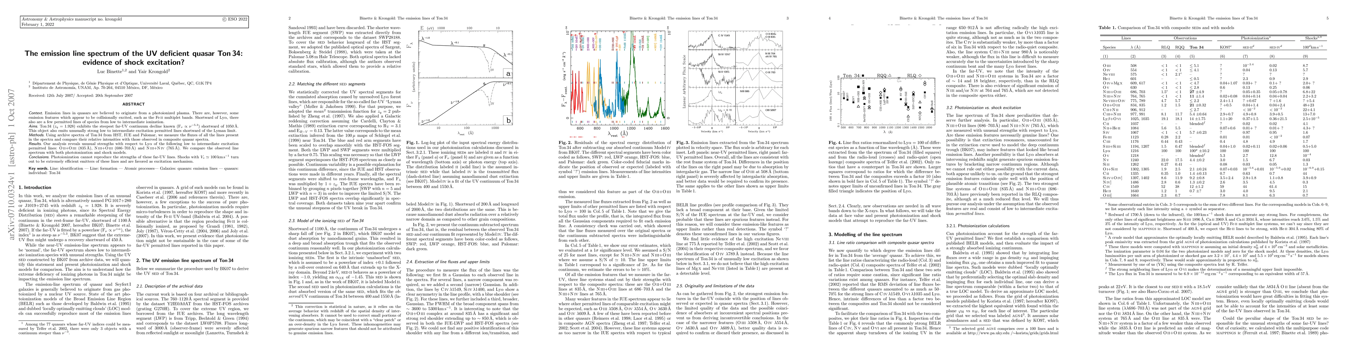 The paper presents a detailed analysis of emission lines in Ton 34, comparing observed line strengths with both photoionization and shock models, and concludes that shocks are a more plausible excitation mechanism for the unusual far-UV lines.