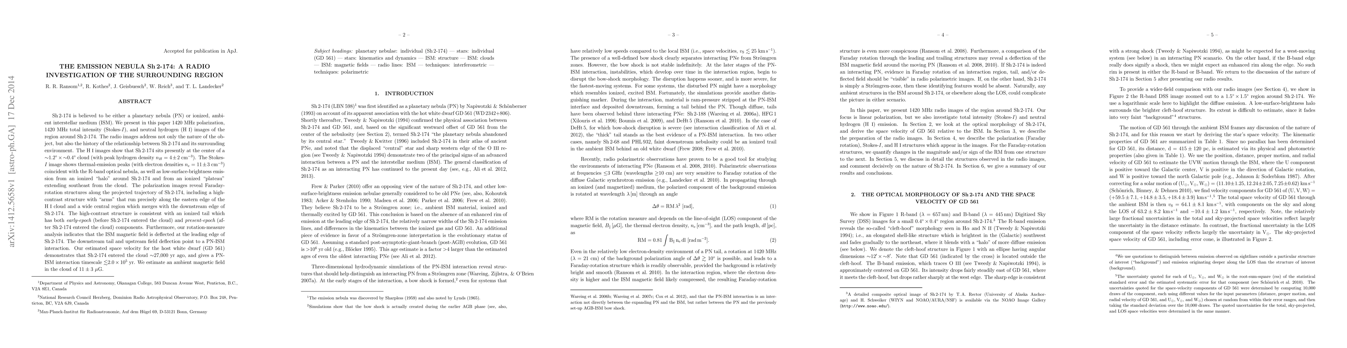 The study of emission nebula Sh 2-174 reveals it's at the center of an HI cloud, with radio emissions showing thermal peaks and ionized halos. Faraday-rotation structures suggest Sh 2-174, likely a planetary nebula, interacted with the ISM about 27,000 yrs ago, with a magnetic field of 11 +/- 3 microGauss in the cloud.
