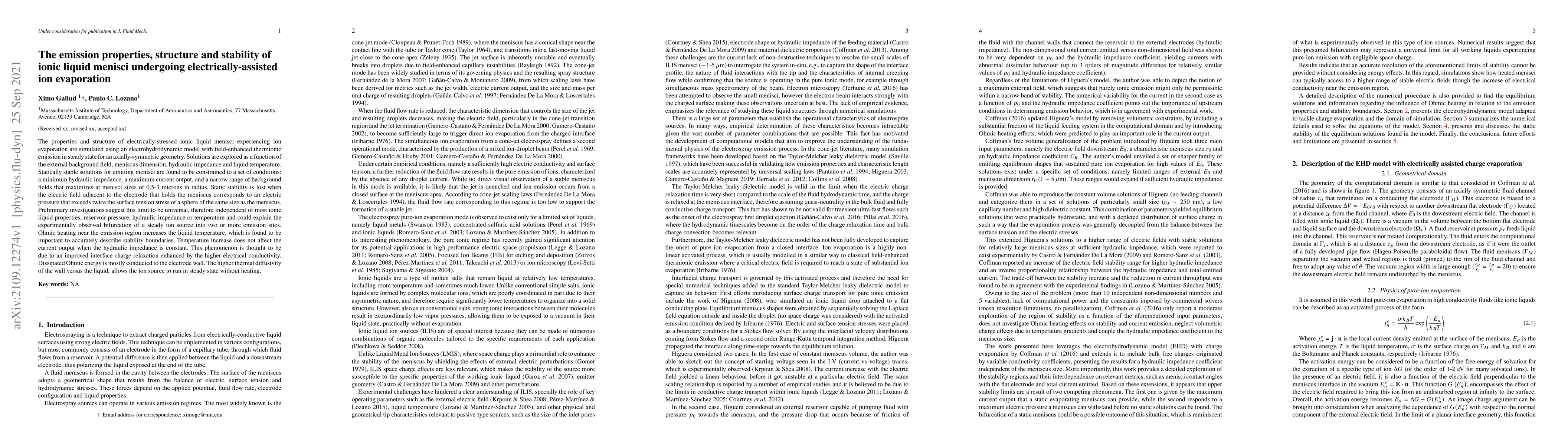 This paper investigates the electrohydrodynamic properties and stability of ionic liquid menisci under electrically-assisted ion evaporation, finding that stable emission requires a specific range of hydraulic impedance and background field, with stability lost when the electric field exceeds twice the surface tension stress. Ohmic heating influences temperature but not current output when impedance is constant.