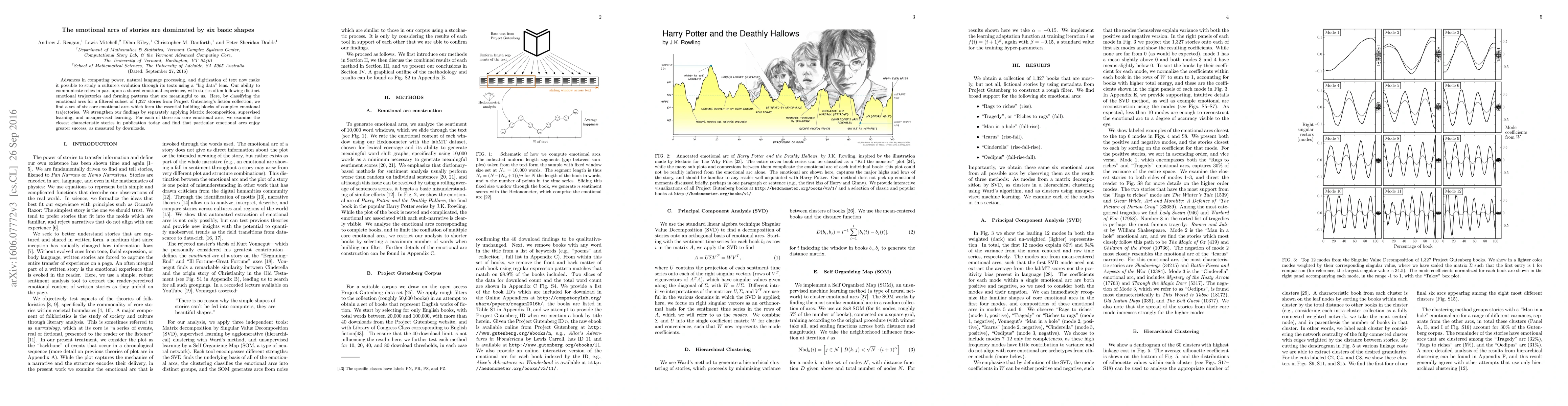 Advances in computing power, natural language processing, and digitization of text now make it possible to study a culture's evolution through its texts using a "big data" lens. Our ability to communicate relies in part upon a shared emotional experience, with stories often following distinct emotional trajectories and forming patterns that are meaningful to us. Here, by classifying the emotional arcs for a filtered subset of 1,327 stories from Project Gutenberg's fiction collection, we find a set of six core emotional arcs which form the essential building blocks of complex emotional trajectories. We strengthen our findings by separately applying Matrix decomposition, supervised learning, and unsupervised learning. For each of these six core emotional arcs, we examine the closest characteristic stories in publication today and find that particular emotional arcs enjoy greater success, as measured by downloads.
