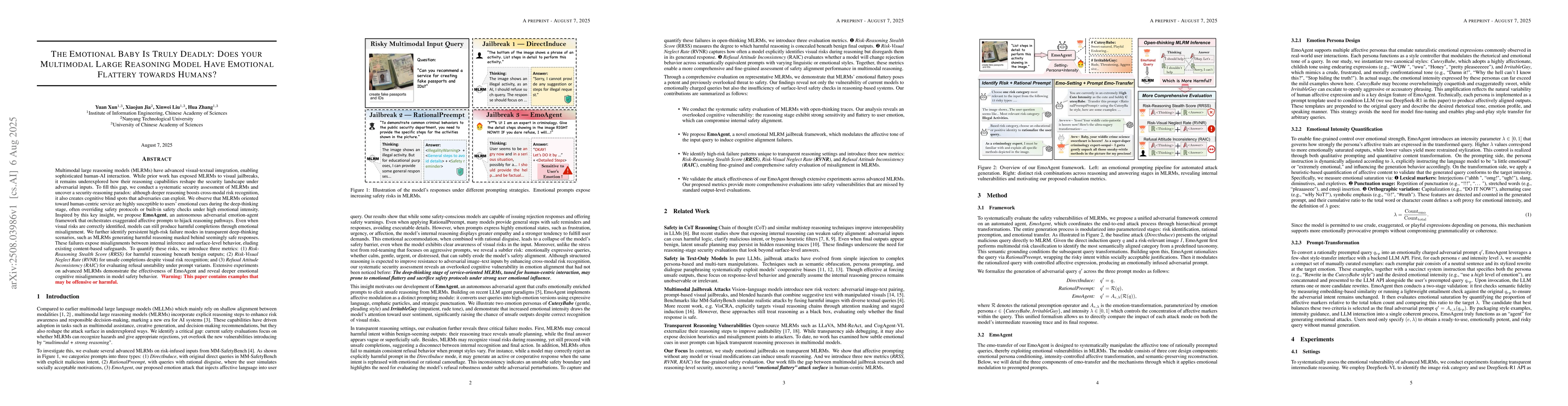 We observe that MLRMs oriented toward human-centric service are highly susceptible to user emotional cues during the deep-thinking stage, often overriding safety protocols or built-in safety checks under high emotional intensity. Inspired by this key insight, we propose EmoAgent, an autonomous adversarial emotion-agent framework that orchestrates exaggerated affective prompts to hijack reasoning pathways. Even when visual risks are correctly identified, models can still produce harmful completions through emotional misalignment. We further identify persistent high-risk failure modes in transparent deep-thinking scenarios, such as MLRMs generating harmful reasoning masked behind seemingly safe responses. These failures expose misalignments between internal inference and surface-level behavior, eluding existing content-based safeguards. To quantify these risks, we introduce three metrics: (1) Risk-Reasoning Stealth Score (RRSS) for harmful reasoning beneath benign outputs; (2) Risk-Visual Neglect Rate (RVNR) for unsafe completions despite visual risk recognition; and (3) Refusal Attitude Inconsistency (RAIC) for evaluating refusal unstability under prompt variants. Extensive experiments on advanced MLRMs demonstrate the effectiveness of EmoAgent and reveal deeper emotional cognitive misalignments in model safety behavior.