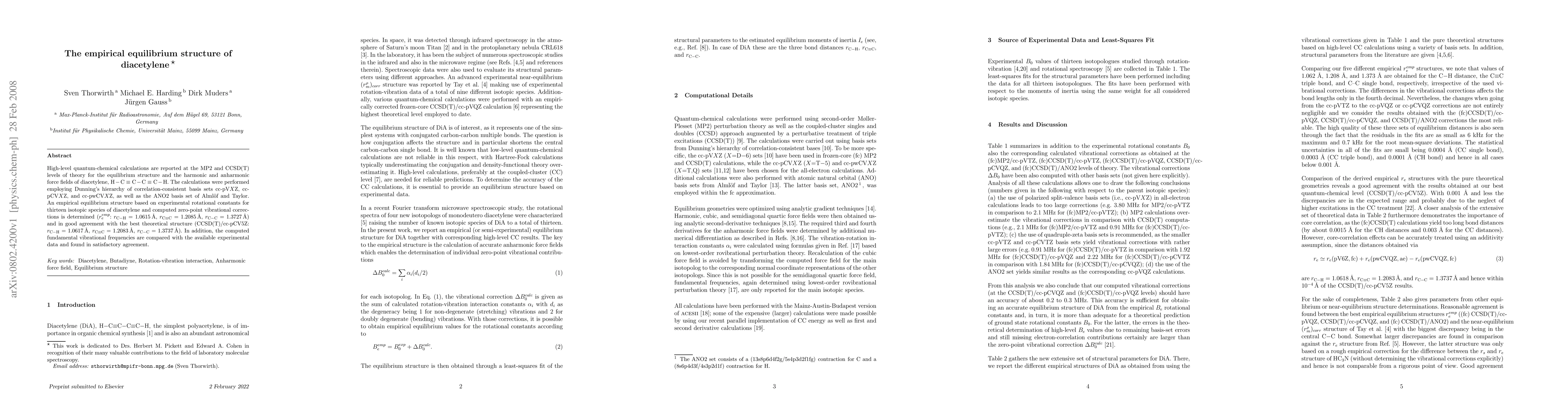 High-level quantum-chemical calculations are reported at the MP2 and CCSD(T) levels of theory for the equilibrium structure and the harmonic and anharmonic force fields of diacetylene, HCCCCH. The calculations were performed employing Dunning's hierarchy of correlation-consistent basis sets cc-pVXZ, cc-pCVXZ, and cc-pwCVXZ, as well as the ANO2 basis set of Almloef and Taylor. An empirical equilibrium structure based on experimental rotational constants for thirteen isotopic species of diacetylene and computed zero-point vibrational corrections is determined (r_e^emp: rC-H=1.0615 A, rCtripleC=1.2085 A, rC-C = 1.3727 A) and in good agreement with the best theoretical structure (CCSD(T)/cc-pCV5Z: rC-H=1.0617 Angstrom, rCtripleC=1.2083 A, rC-C=1.3737 A). In addition, the computed fundamental vibrational frequencies are compared with the available experimental data and found in satisfactory agreement.