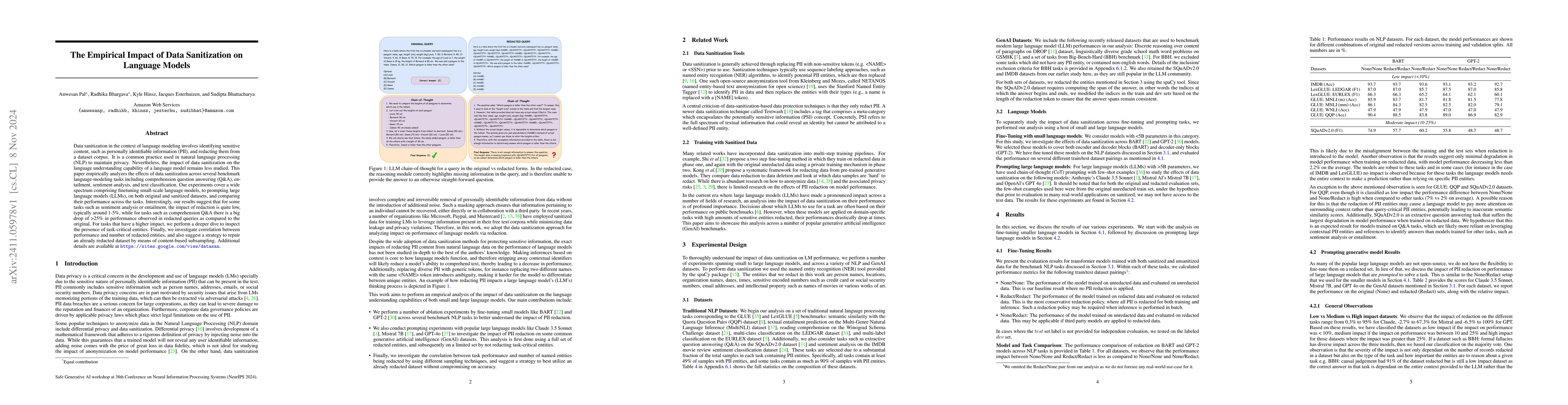 This paper investigates the empirical effects of data sanitization on language models, examining its impact across various NLP tasks. The results indicate minimal (<1-5%) performance drops for tasks like sentiment analysis and entailment, while comprehension tasks show a significant (>25%) decline due to the redaction of task-critical entities.