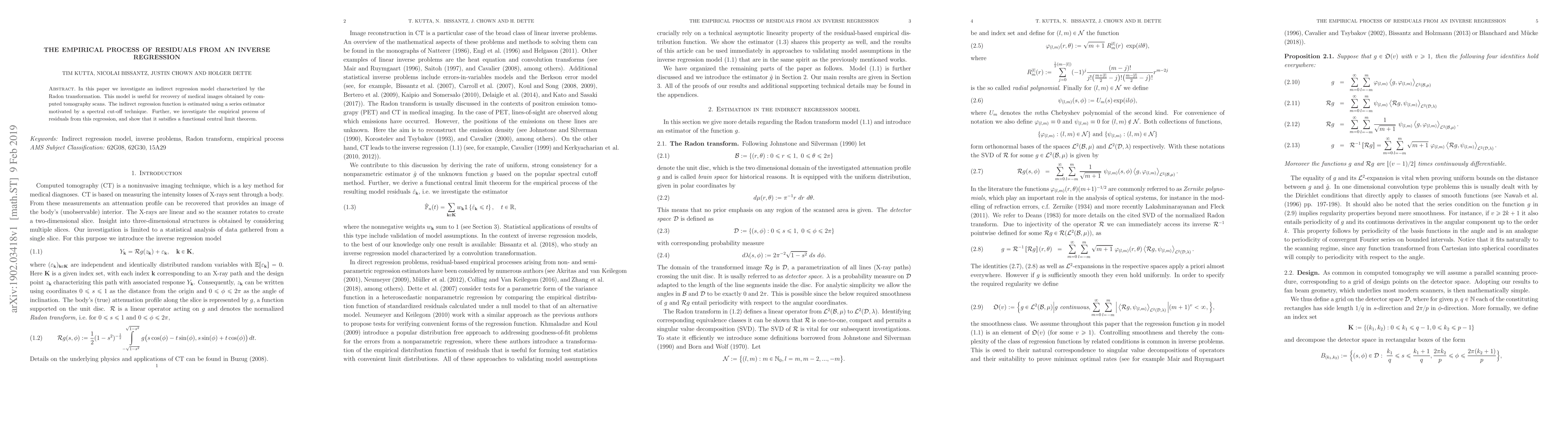 This paper explores an indirect regression model based on the Radon transformation for medical image recovery from computed tomography scans, estimating the regression function using a series estimator. It also examines the empirical process of residuals, demonstrating that it adheres to a functional central limit theorem.