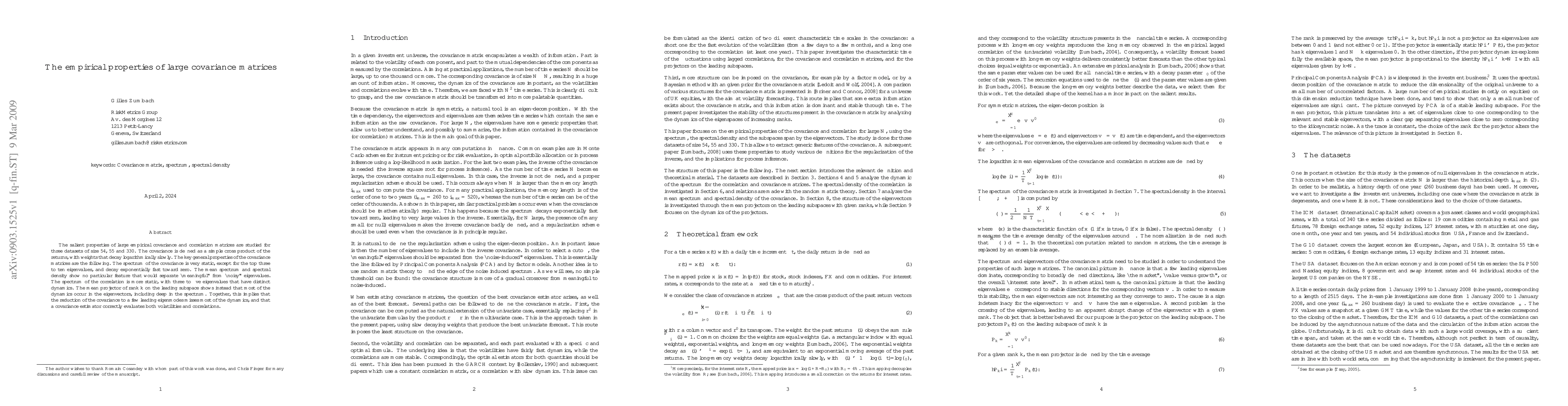 The salient properties of large empirical covariance and correlation matrices are studied for three datasets of size 54, 55 and 330. The covariance is defined as a simple cross product of the returns, with weights that decay logarithmically slowly. The key general properties of the covariance matrices are the following. The spectrum of the covariance is very static, except for the top three to ten eigenvalues, and decay exponentially fast toward zero. The mean spectrum and spectral density show no particular feature that would separate "meaningful" from "noisy" eigenvalues. The spectrum of the correlation is more static, with three to five eigenvalues that have distinct dynamics. The mean projector of rank k on the leading subspace shows instead that most of the dynamics occur in the eigenvectors, including deep in the spectrum. Together, this implies that the reduction of the covariance to a few leading eigenmodes misses most of the dynamics, and that a covariance estimator correctly evaluates both volatilities and correlations.