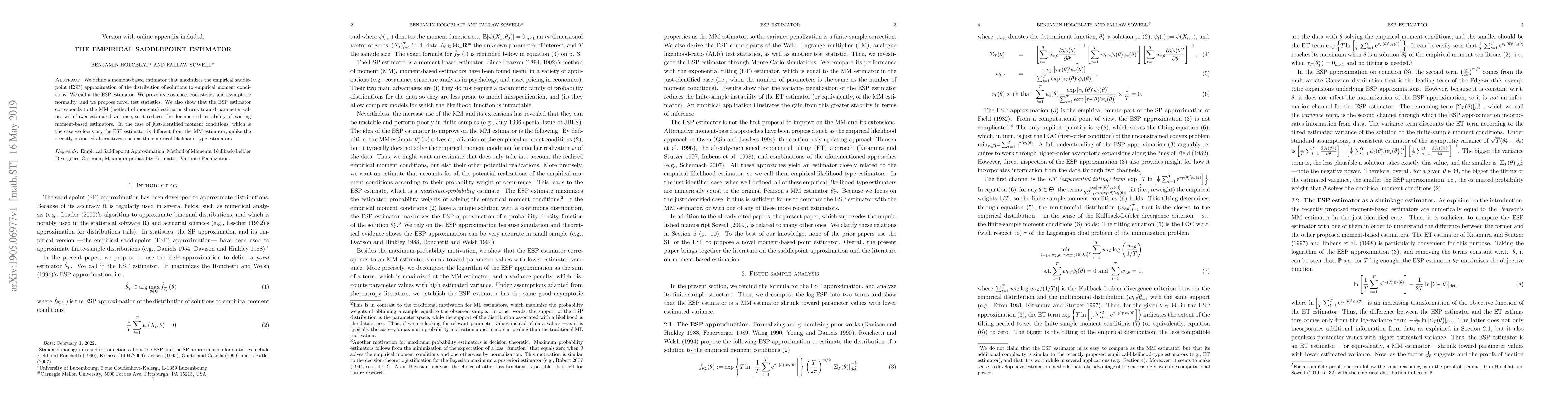 We define a moment-based estimator that maximizes the empirical saddlepoint (ESP) approximation of the distribution of solutions to empirical moment conditions. We call it the ESP estimator. We prove its existence, consistency and asymptotic normality, and we propose novel test statistics. We also show that the ESP estimator corresponds to the MM (method of moments) estimator shrunk toward parameter values with lower estimated variance, so it reduces the documented instability of existing moment-based estimators. In the case of just-identified moment conditions, which is the case we focus on, the ESP estimator is different from the MM estimator, unlike the recently proposed alternatives, such as the empirical-likelihood-type estimators.