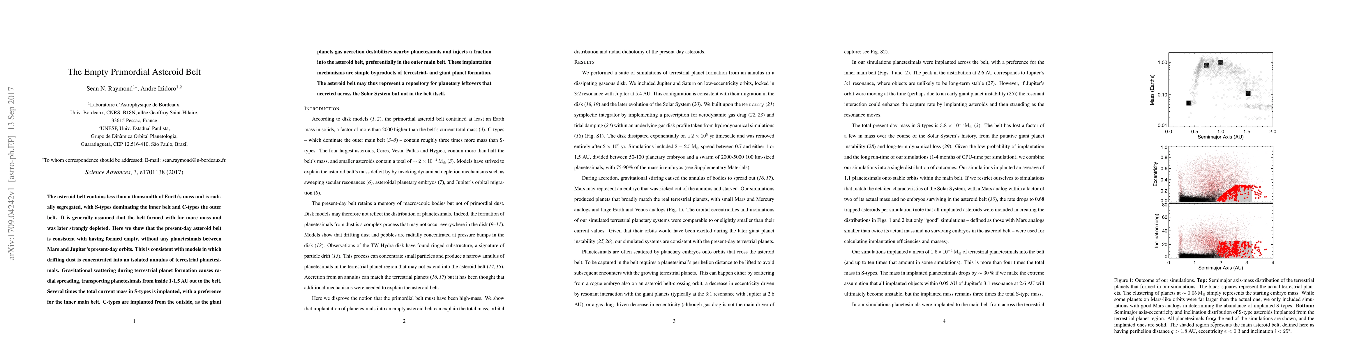 The asteroid belt likely formed empty and was later populated by planetesimals from inside and outside the current belt region, driven by gravitational scattering during terrestrial and giant planet formation. This process explains the belt's current mass and composition, with S-types in the inner belt and C-types in the outer belt.
