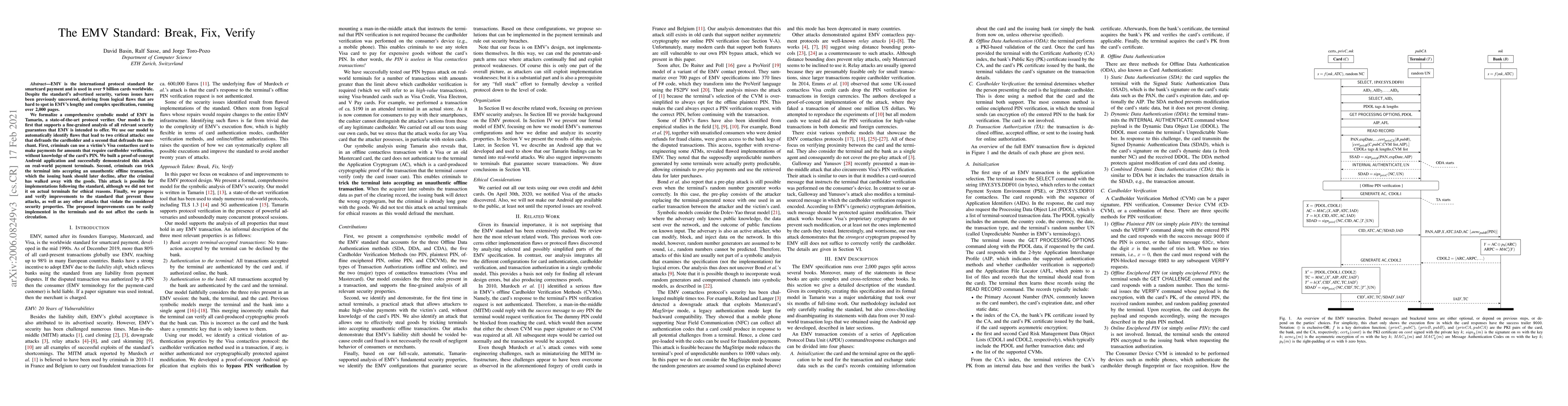The paper presents a formal model of the EMV standard using Tamarin, revealing logical flaws leading to critical attacks and proposing verified improvements.