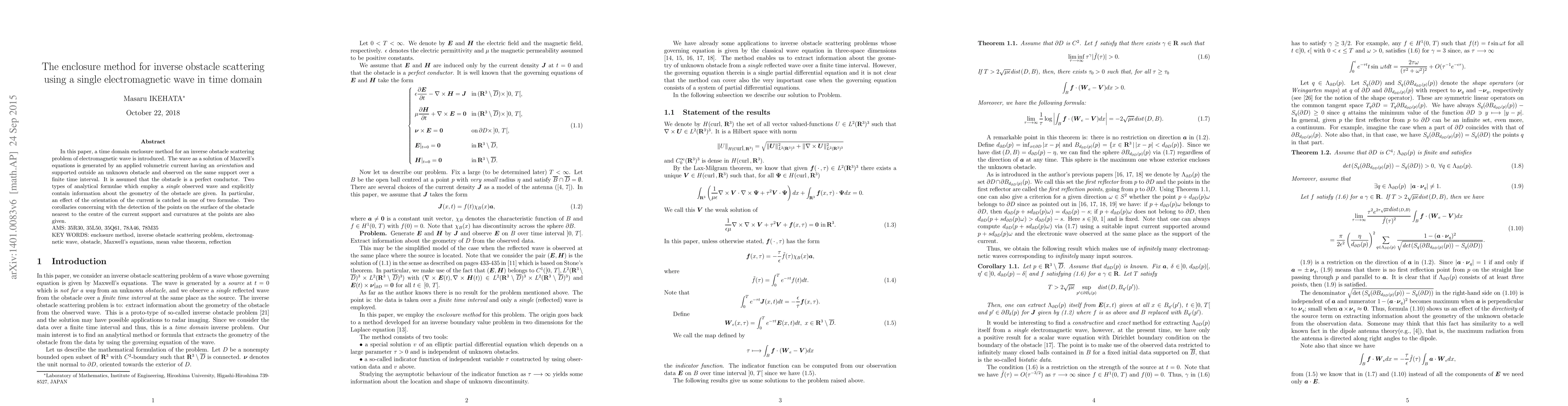 This paper introduces a time domain enclosure method for solving inverse obstacle scattering problems using a single electromagnetic wave. It provides analytical formulae that utilize the wave's geometry and current orientation, and includes corollaries for detecting the nearest points on the obstacle's surface and their curvatures.