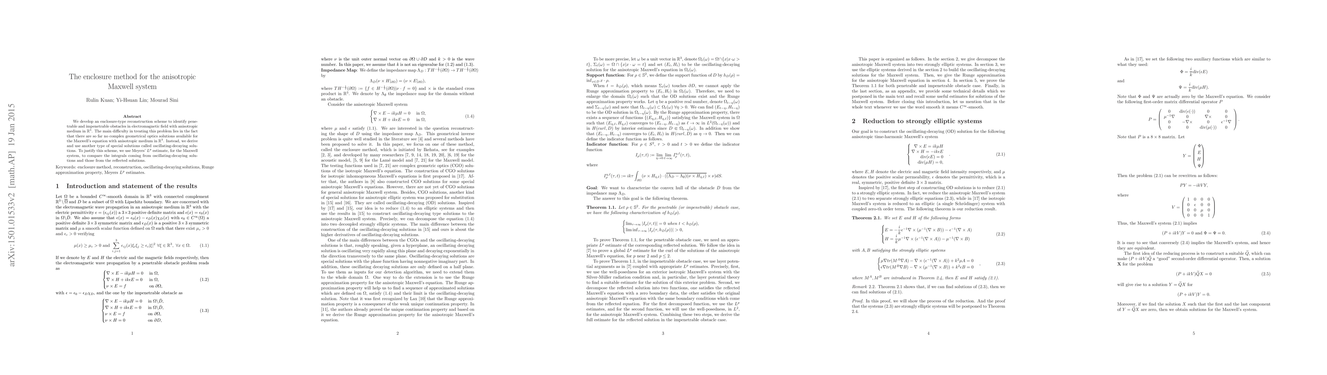This paper proposes an enclosure reconstruction scheme to identify obstacles in anisotropic electromagnetic fields using oscillating-decaying solutions due to the absence of complex geometrical optics solutions. The method's validity is justified using Meyers' L^p estimates for the Maxwell system.