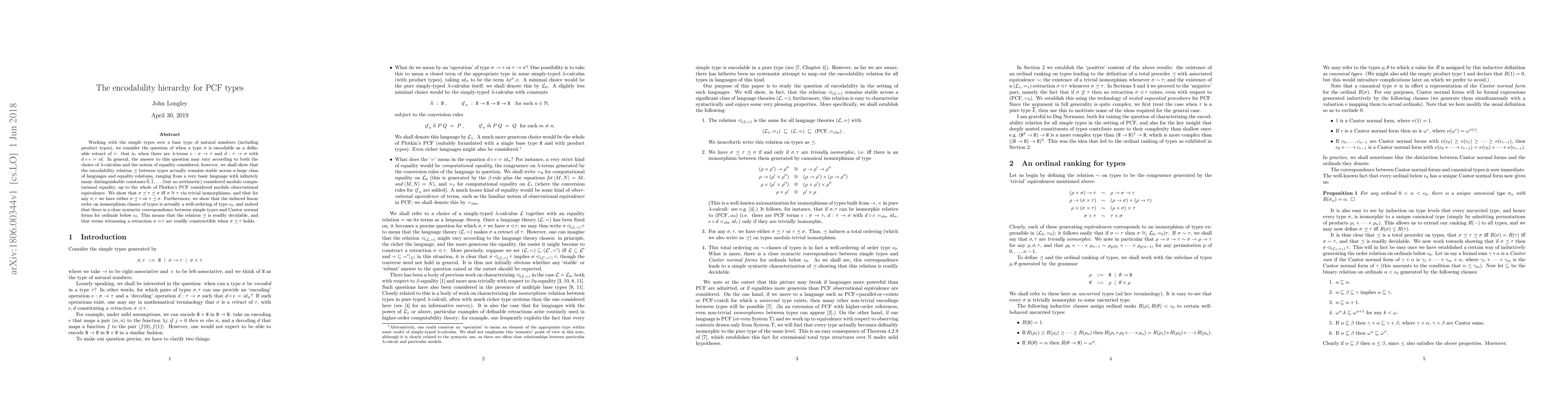 Working with the simple types over a base type of natural numbers (including product types), we consider the question of when a type $\sigma$ is encodable as a definable retract of $\tau$: that is, when there are $\lambda$-terms $e:\sigma\rightarrow\tau$ and $d:\tau\rightarrow\sigma$ with $d \circ e = id$. In general, the answer to this question may vary according to both the choice of $\lambda$-calculus and the notion of equality considered; however, we shall show that the encodability relation $\preceq$ between types actually remains stable across a large class of languages and equality relations, ranging from a very basic language with infinitely many distinguishable constants $0,1,\ldots$ (but no arithmetic) considered modulo computational equality, up to the whole of Plotkin's PCF considered modulo observational equivalence. We show that $\sigma \preceq \tau \preceq \sigma$ iff $\sigma \cong \tau$ via trivial isomorphisms, and that for any $\sigma,\tau$ we have either $\sigma \preceq \tau$ or $\tau \preceq \sigma$. Furthermore, we show that the induced linear order on isomorphism classes of types is actually a well-ordering of type $\epsilon_0$, and indeed that there is a close syntactic correspondence between simple types and Cantor normal forms for ordinals below $\epsilon_0$. This means that the relation $\preceq$ is readily decidable, and that terms witnessing a retraction $\sigma \lhd \tau$ are readily constructible when $\sigma \preceq \tau$ holds.