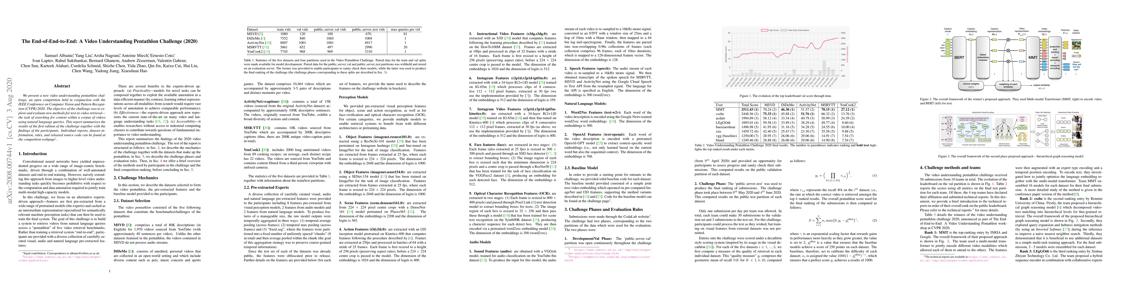 We present a new video understanding pentathlon challenge, an open competition held in conjunction with the IEEE Conference on Computer Vision and Pattern Recognition (CVPR) 2020. The objective of the challenge was to explore and evaluate new methods for text-to-video retrieval-the task of searching for content within a corpus of videos using natural language queries. This report summarizes the results of the first edition of the challenge together with the findings of the participants.