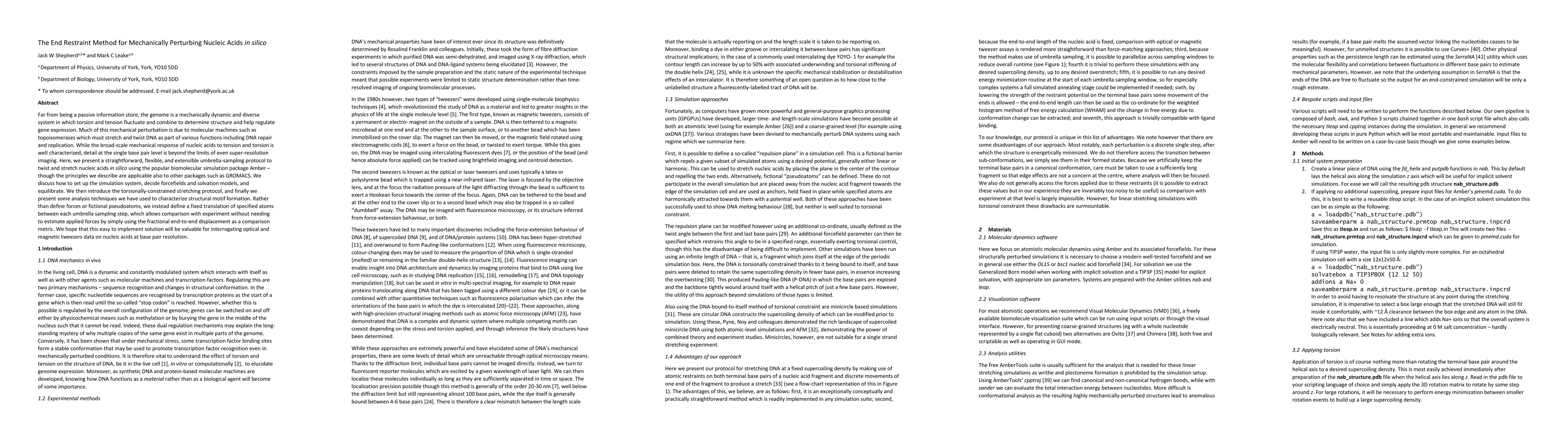 This paper proposes an end restraint method to simulate mechanical perturbations of nucleic acids using the Amber simulation package, facilitating detailed studies at the single base pair level. The method involves translating specified atoms to define torsional constraints, allowing for direct comparison with experimental data without estimating applied forces.