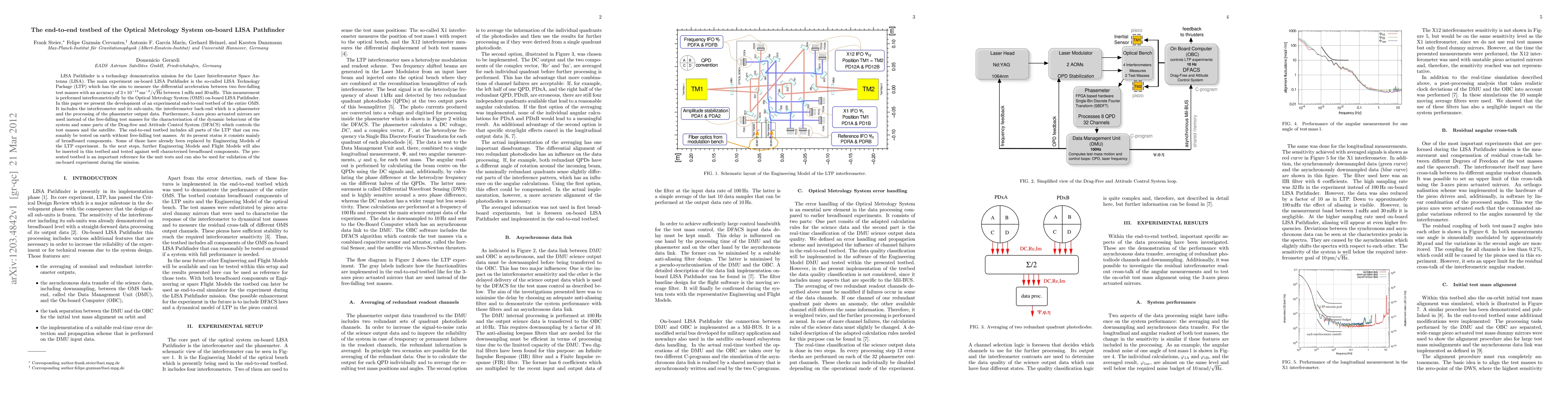 The paper details the development of an end-to-end testbed for the Optical Metrology System (OMS) on-board LISA Pathfinder, including the interferometer, phasemeter, and data processing. It employs 3-axes piezo actuated mirrors to characterize system dynamics and parts of the Drag-free and Attitude Control System (DFACS).