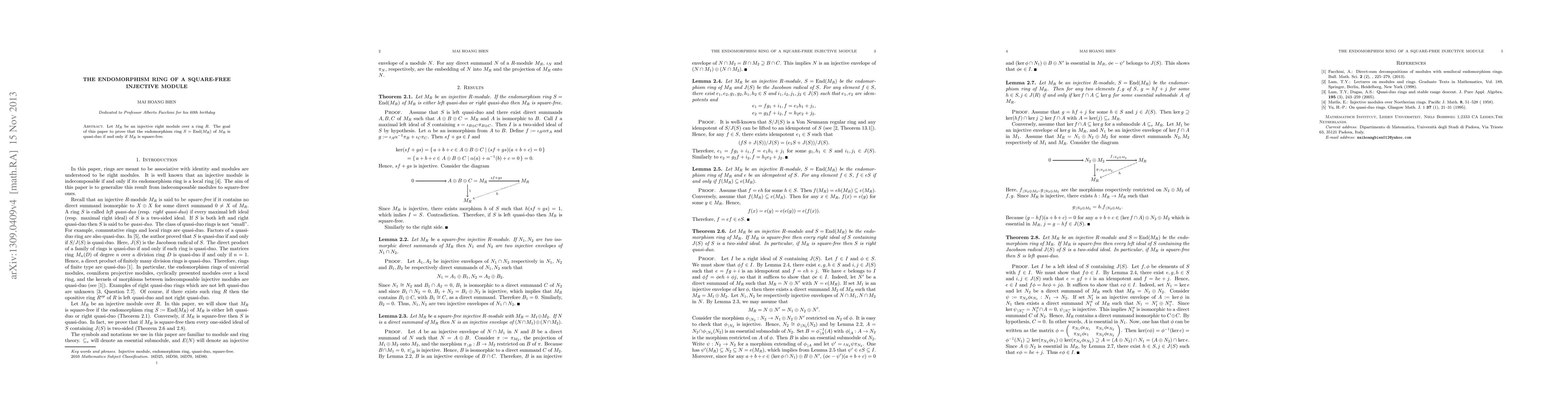 Summary: This paper proves that the endomorphism ring of an injective right module $M_R$ over a ring $R$ is quasi-duo if and only if $M_R$ is square-free, establishing a crucial link between module properties and ring characteristics.