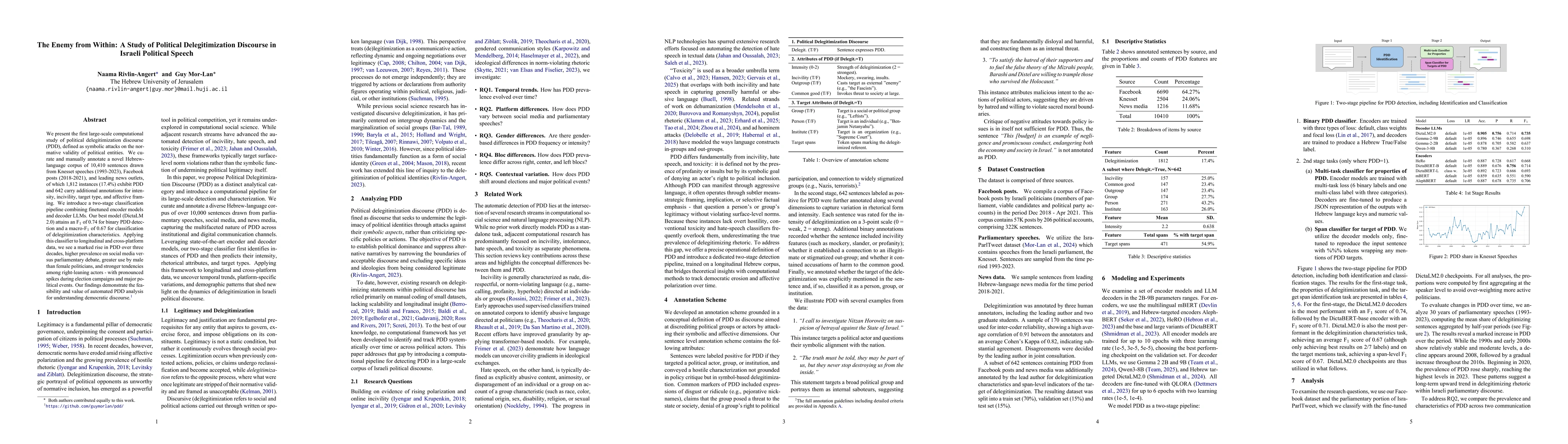 We present the first large-scale computational study of political delegitimization discourse (PDD), defined as symbolic attacks on the normative validity of political entities. We curate and manually annotate a novel Hebrew-language corpus of 10,410 sentences drawn from Knesset speeches (1993-2023), Facebook posts (2018-2021), and leading news outlets, of which 1,812 instances (17.4\%) exhibit PDD and 642 carry additional annotations for intensity, incivility, target type, and affective framing. We introduce a two-stage classification pipeline combining finetuned encoder models and decoder LLMs. Our best model (DictaLM 2.0) attains an F$_1$ of 0.74 for binary PDD detection and a macro-F$_1$ of 0.67 for classification of delegitimization characteristics. Applying this classifier to longitudinal and cross-platform data, we see a marked rise in PDD over three decades, higher prevalence on social media versus parliamentary debate, greater use by male than female politicians, and stronger tendencies among right-leaning actors - with pronounced spikes during election campaigns and major political events. Our findings demonstrate the feasibility and value of automated PDD analysis for understanding democratic discourse.