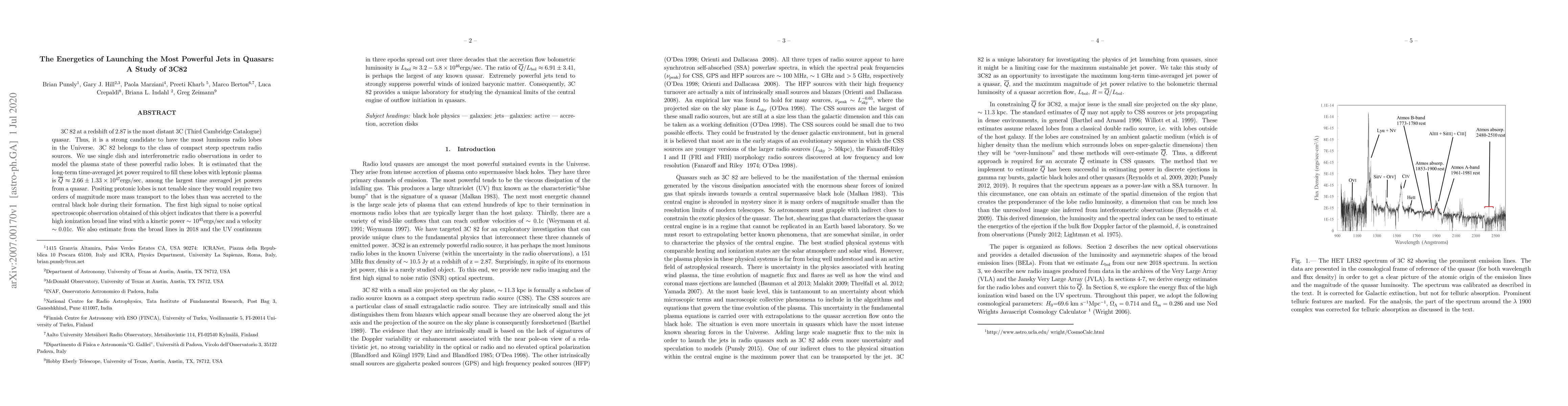 3C 82 at a redshift of 2.87 is the most distant 3C (Third Cambridge Catalogue) quasar. Thus, it is a strong candidate to have the most luminous radio lobes in the Universe. 3C 82 belongs to the class of compact steep spectrum radio sources. We use single dish and interferometric radio observations in order to model the plasma state of these powerful radio lobes. It is estimated that the long-term time-averaged jet power required to fill these lobes with leptonic plasma is $\overline{Q} \approx 2.66 \pm 1.33 \times 10^{47} \rm{ergs/sec}$, among the largest time averaged jet powers from a quasar. Positing protonic lobes is not tenable since they would require two orders of magnitude more mass transport to the lobes than was accreted to the central black hole during their formation. The first high signal to noise optical spectroscopic observation obtained of this object indicates that there is a powerful high ionization broad line wind with a kinetic power $\sim 10^{45} \rm{ergs/sec}$ and a velocity $\sim 0.01$c. We also estimate from the broad lines in 2018 and the UV continuum in three epochs spread out over three decades that the accretion flow bolometric luminosity is $L_{\rm{bol}} \approx 3.2-5.8 \times 10^{46} \rm{ergs/sec}$. The ratio of $\overline{Q}/L_{\rm{bol}}\approx 6.91 \pm 3.41$, is perhaps the largest of any known quasar. Extremely powerful jets tend to strongly suppress powerful winds of ionized baryonic matter. Consequently, 3C 82 provides a unique laboratory for studying the dynamical limits of the central engine of outflow initiation in quasars.